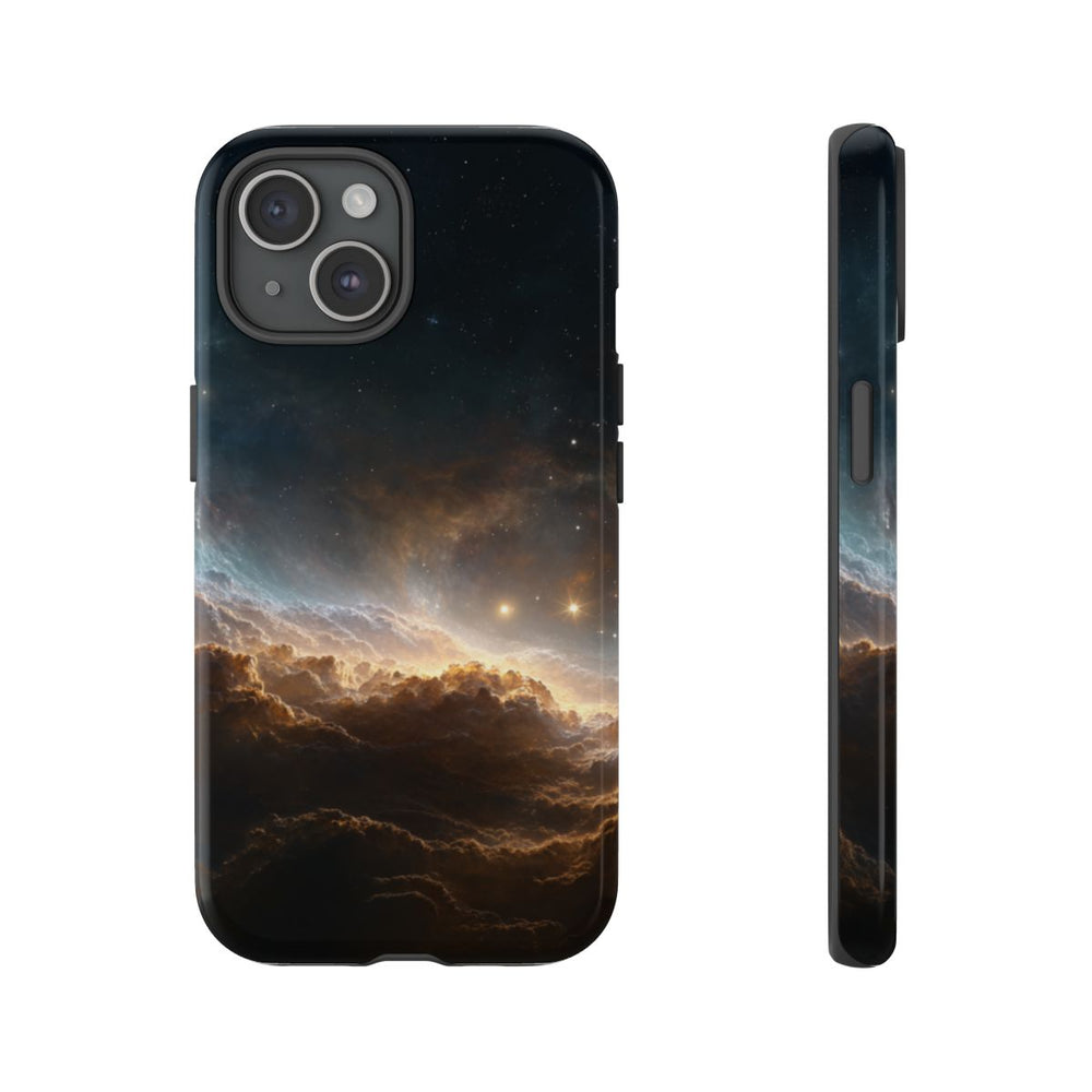 Dit hoesje heeft een indrukwekkend ontwerp met een dichte nevel en heldere sterren verspreid over een donkere hemel. De afbeelding toont een gloeiende horizon van wolken, verlicht door warm licht dat overloopt in koelere blauwe en zwarte tinten. De sterren verschillen in helderheid en geven het ruimte-thema extra diepte en realisme. Het hoesje bestaat uit twee lagen: een glanzende buitenkant van polycarbonaat en een TPU-binnenzijde. Dit zorgt voor extra stevigheid en bescherming, ook buitenshuis. Ondersteunt draadloos opladen.