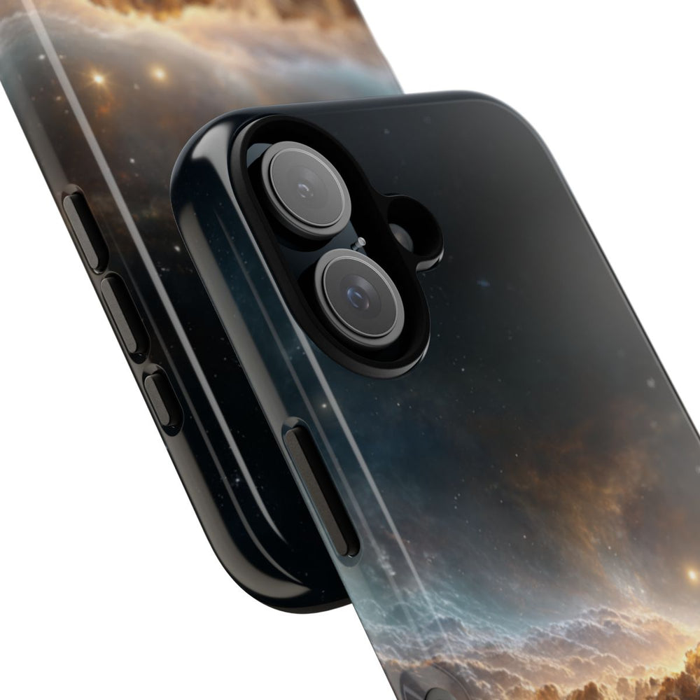 Dit hoesje heeft een indrukwekkend ontwerp met een dichte nevel en heldere sterren verspreid over een donkere hemel. De afbeelding toont een gloeiende horizon van wolken, verlicht door warm licht dat overloopt in koelere blauwe en zwarte tinten. De sterren verschillen in helderheid en geven het ruimte-thema extra diepte en realisme. Het hoesje bestaat uit twee lagen: een glanzende buitenkant van polycarbonaat en een TPU-binnenzijde. Dit zorgt voor extra stevigheid en bescherming, ook buitenshuis. Ondersteunt draadloos opladen.