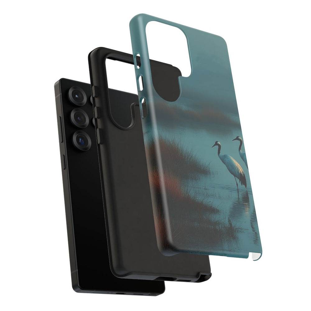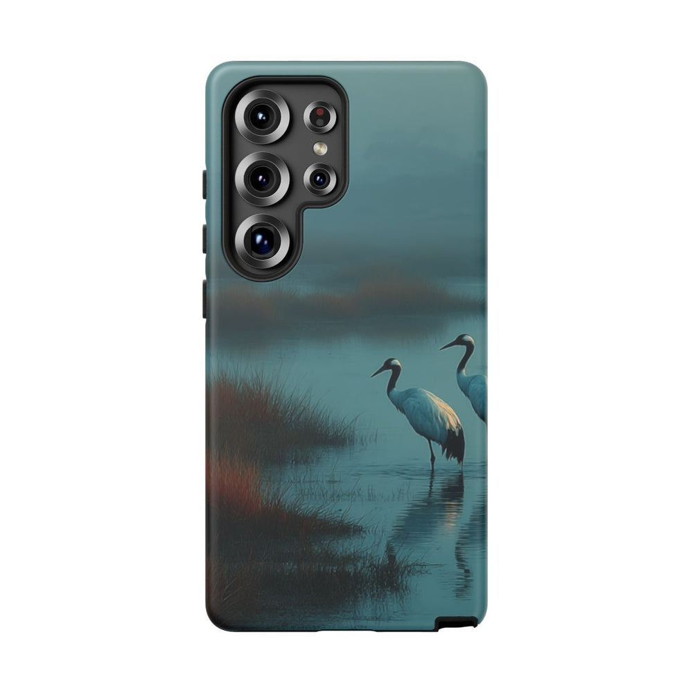 Dit hoesje heeft een ontwerp met twee witte kraanvogels die in ondiep water staan, omringd door plukken roodbruin gras. De sfeer is rustig, met een kalme, spiegelende waterspiegel in een mistig moerasgebied. Op de achtergrond zijn vage silhouetten van bomen te zien onder een gedempte, nevelige lucht. Het hoesje bestaat uit twee lagen met een matte afwerking en is gemaakt van polycarbonaat en TPU. Geschikt voor draadloos opladen. Niet geschikt voor MagSafe.