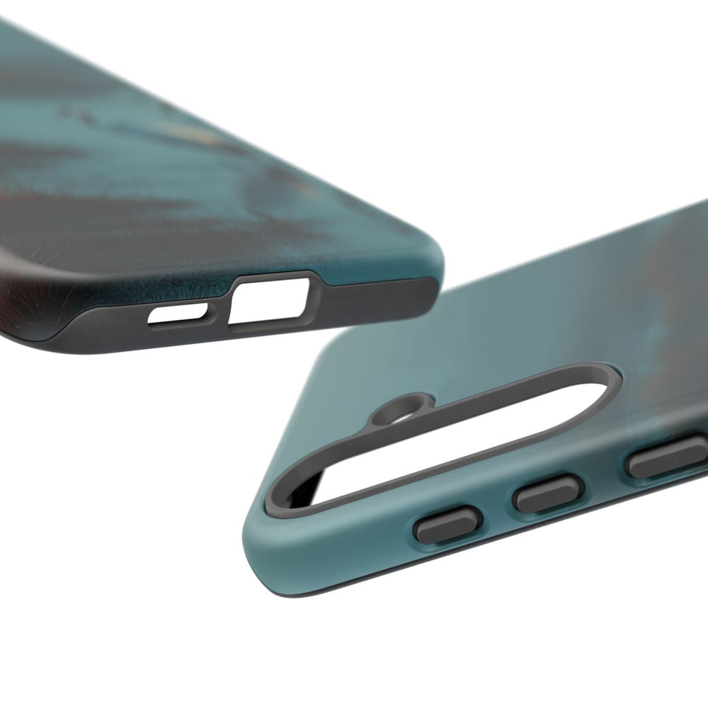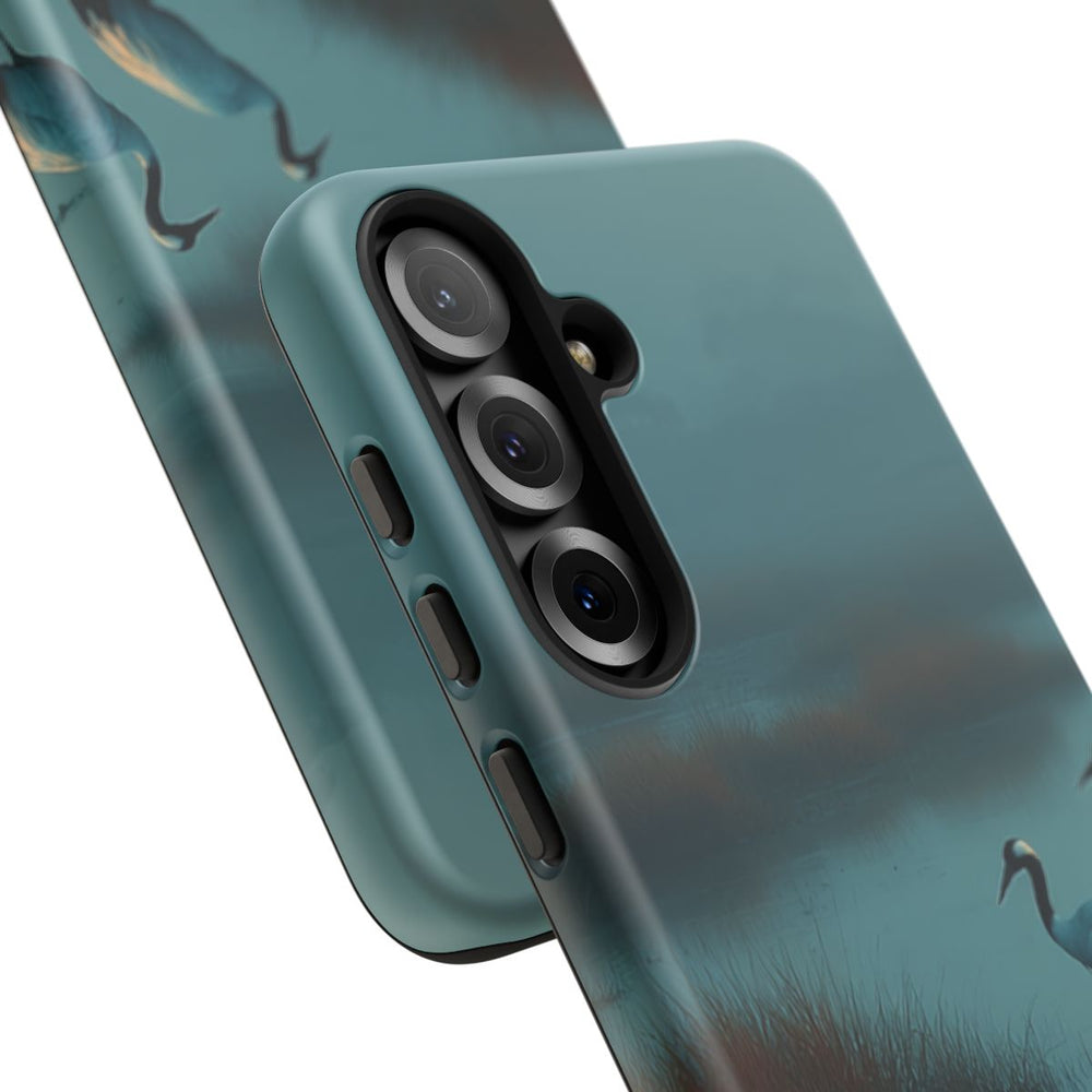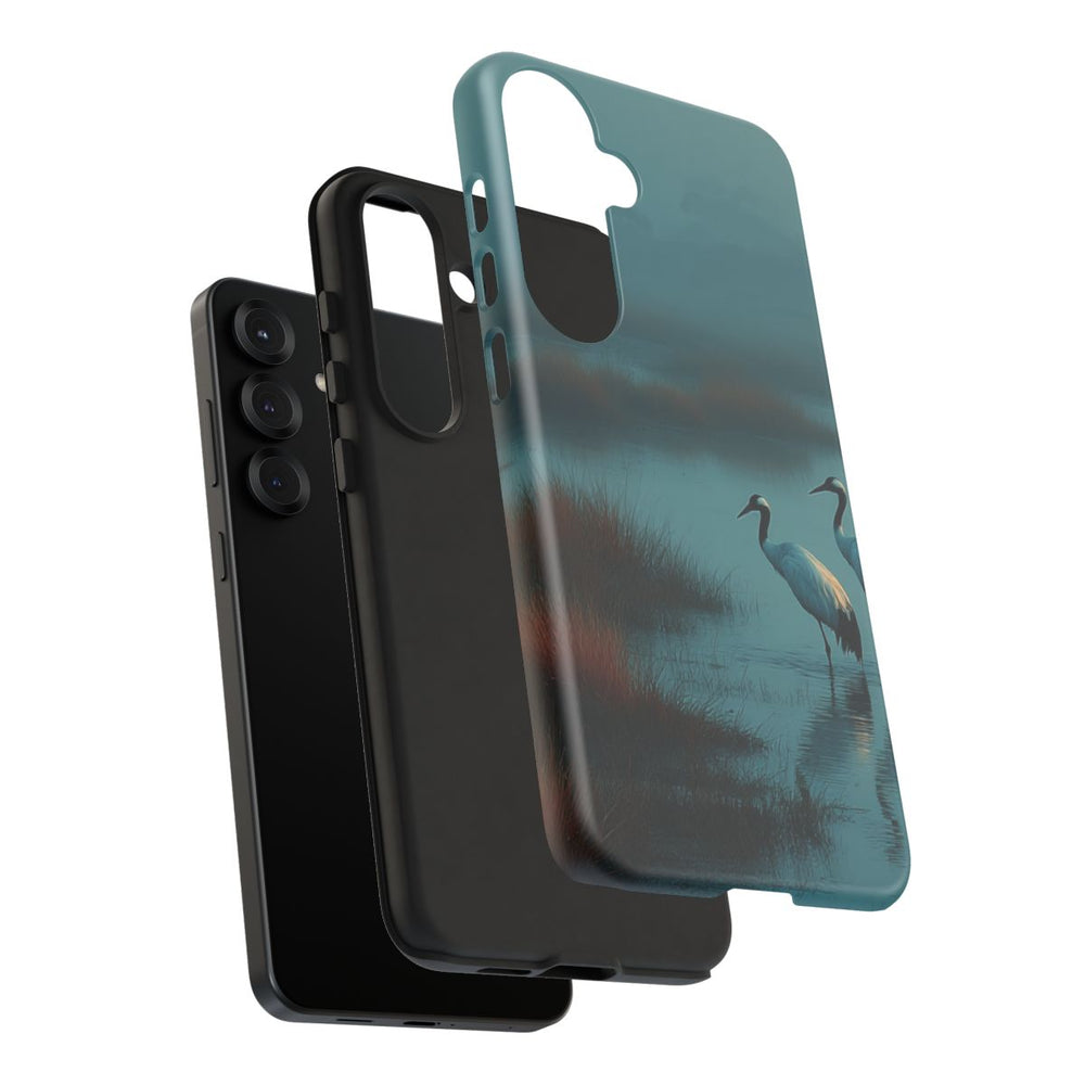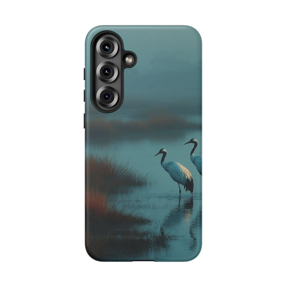 Dit hoesje toont twee kraanvogels die rustig in ondiep water staan, omringd door roodbruine graspollen. Op de achtergrond is een mistig landschap te zien met vage silhouetten van bomen, wat zorgt voor een serene en rustgevende moerassfeer. Het hoesje is dubbel gelaagd met een stevige polycarbonaat buitenkant en een TPU-binnenzijde voor extra bescherming. Ondersteunt draadloos opladen. Niet geschikt voor MagSafe.