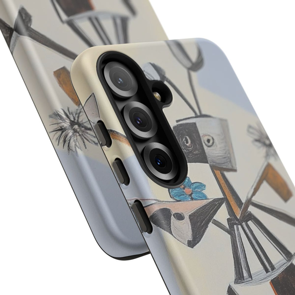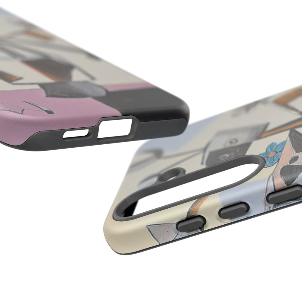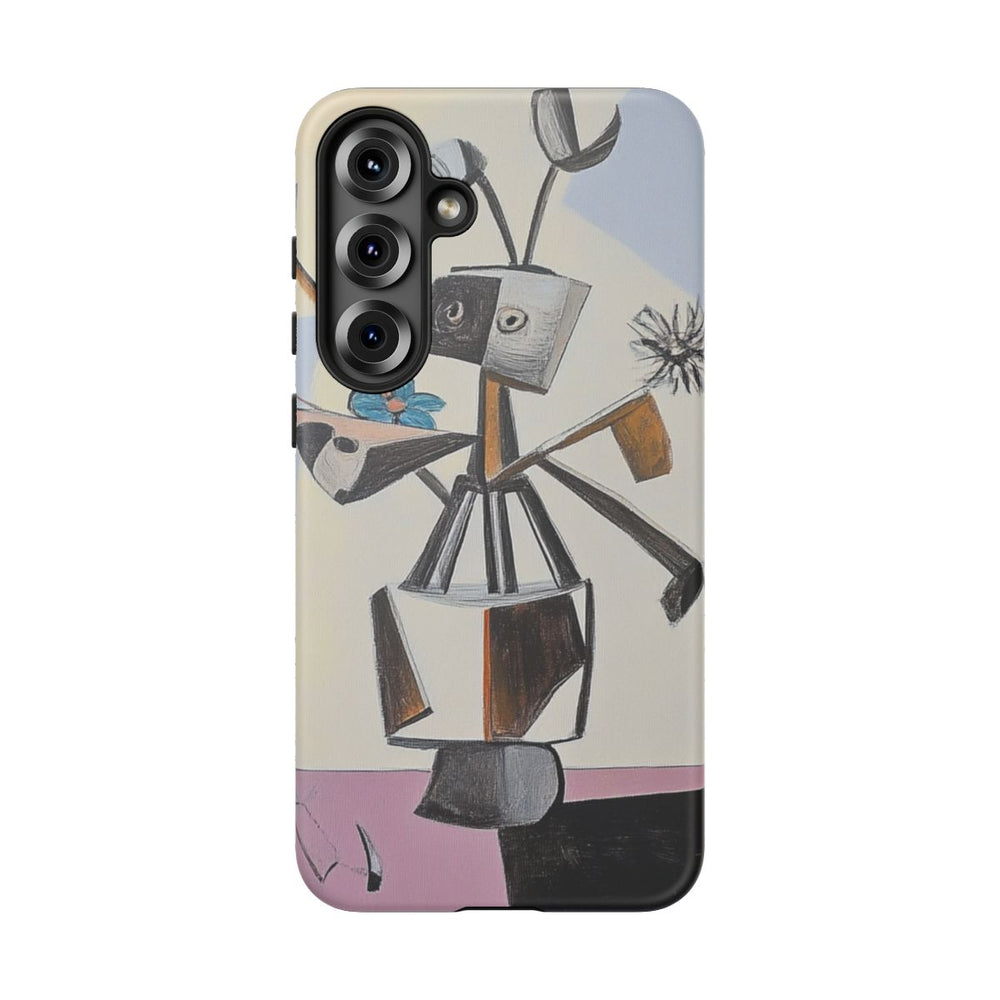 Dit hoesje heeft een kubistische interpretatie van een bloemstuk, waarbij bloemen en bladeren zijn weergegeven met geometrische vormen en abstracte lijnen. De kleurencombinatie bestaat uit zachte pasteltinten en opvallende contrasten, wat zorgt voor een bijzonder visueel effect. De achtergrond is licht van kleur, terwijl het bloemstuk op een donkerdere ondergrond is geplaatst. Het hoesje heeft een dubbele laag voor extra bescherming en is geschikt voor draadloos opladen.