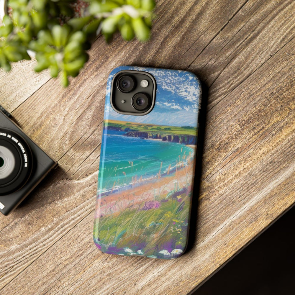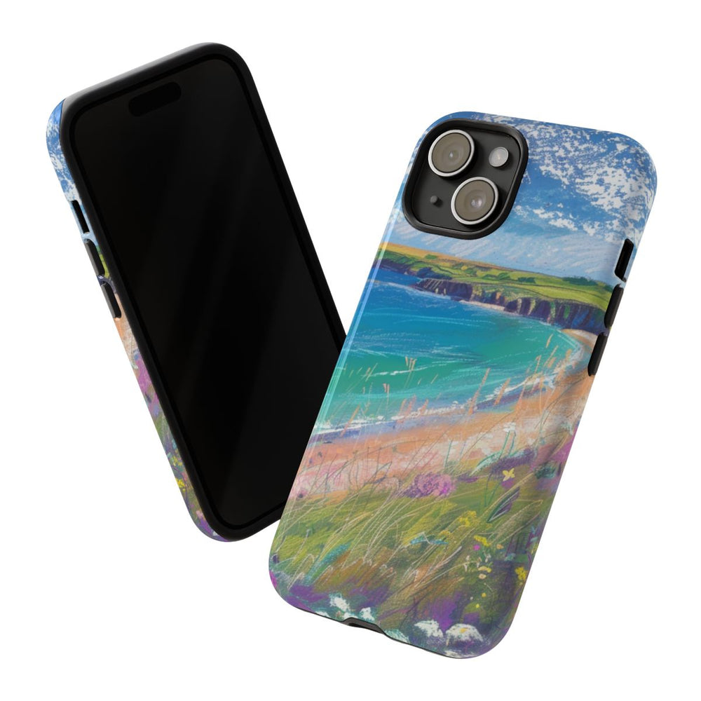Dit telefoonhoesje toont een levendig kustlandschap met een zandstrand dat langs de kustlijn slingert. Op de voorgrond bloeien kleurrijke wilde bloemen en grassen in tinten paars, wit, geel en groen. De blauwe zee strekt zich uit onder een heldere lucht met verspreide witte wolken. Op de achtergrond zijn groene kliffen en rotsformaties langs de kust zichtbaar. Het ontwerp is gedrukt op een glanzend, stevig hoesje met een polycarbonaat buitenkant en een TPU binnenzijde. Dit hoesje is duurzaam, bestand tegen verschillende weersomstandigheden en geschikt voor draadloos opladen.