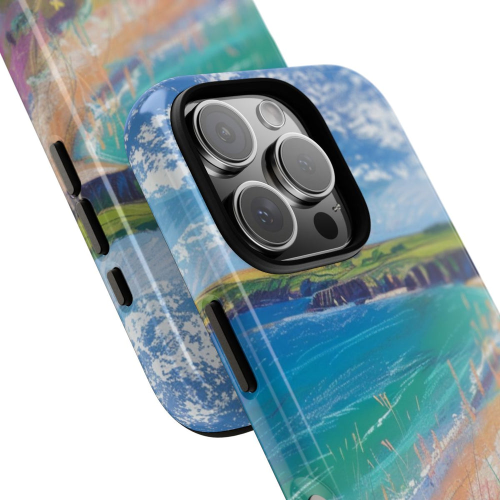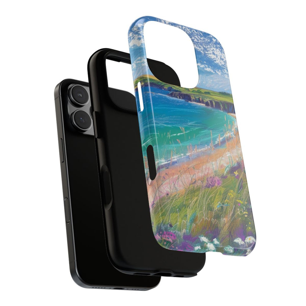 Dit telefoonhoesje toont een levendig kustlandschap met een zandstrand dat langs de kustlijn slingert. Op de voorgrond bloeien kleurrijke wilde bloemen en grassen in tinten paars, wit, geel en groen. De blauwe zee strekt zich uit onder een heldere lucht met verspreide witte wolken. Op de achtergrond zijn groene kliffen en rotsformaties langs de kust zichtbaar. Het ontwerp is gedrukt op een glanzend, stevig hoesje met een polycarbonaat buitenkant en een TPU binnenzijde. Dit hoesje is duurzaam, bestand tegen verschillende weersomstandigheden en geschikt voor draadloos opladen.