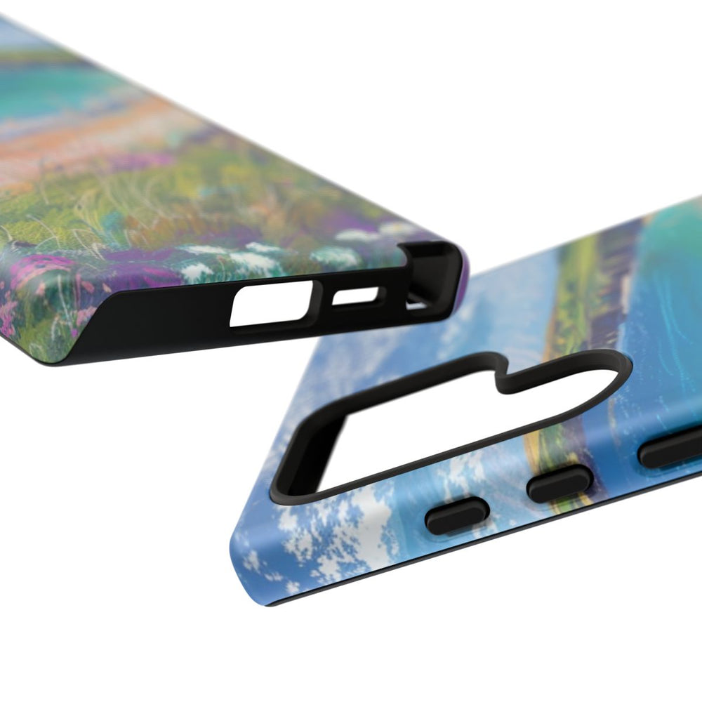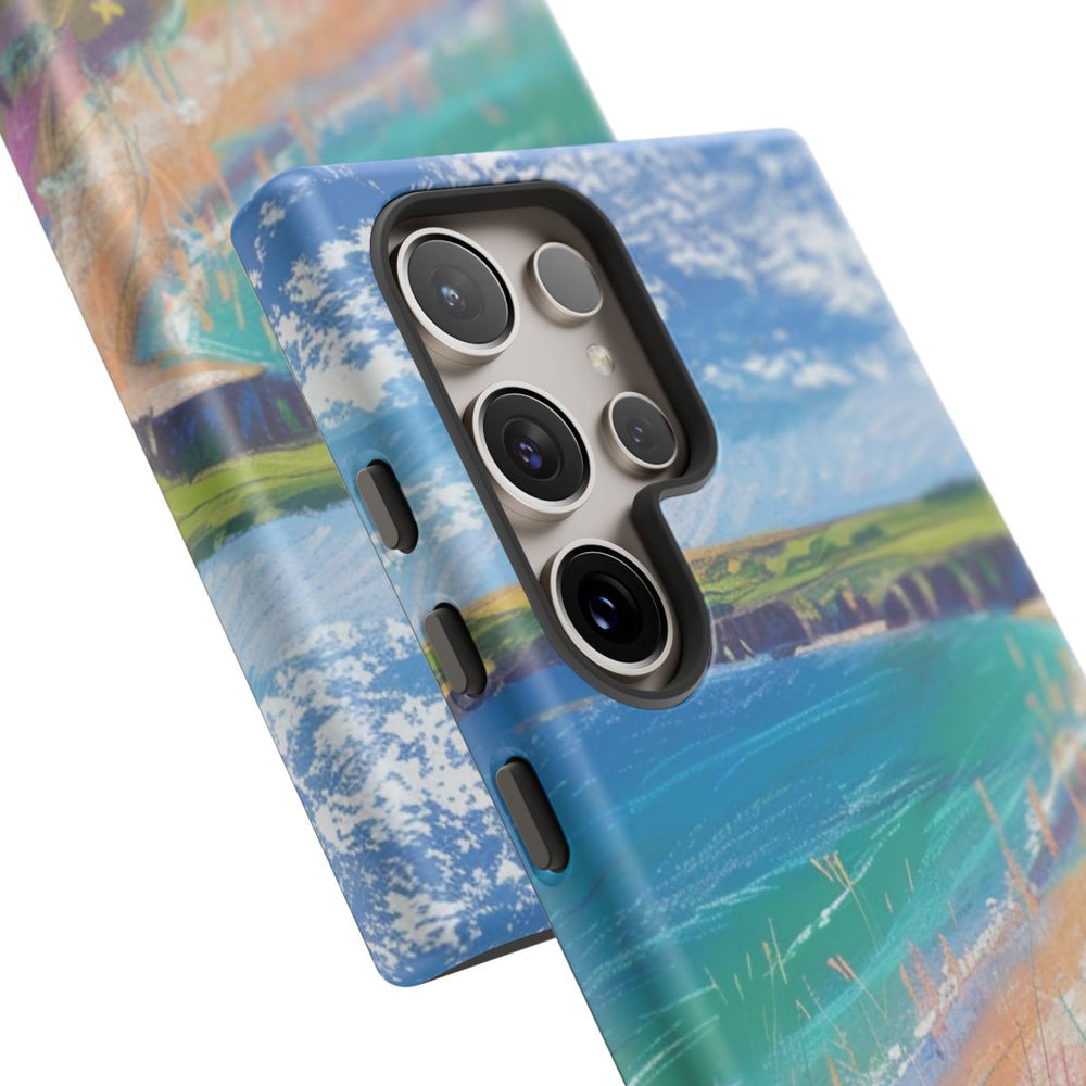 Dit ontwerp toont een levendig kustlandschap met een zandstrand dat sierlijk langs de kustlijn loopt. De zee schittert in tinten blauw en turquoise onder een heldere lucht met verspreide witte wolken. Op de voorgrond staan kleurrijke wilde bloemen en grassen in paars, wit, geel en groen, wat zorgt voor een vrolijk en natuurlijk geheel. Op de achtergrond zijn kliffen en grasvelden te zien die zich langs de kust uitstrekken. De afbeelding is gedrukt op een stevige, matte hoesje met dubbele laag van polycarbonaat en TPU, wat zorgt voor extra duurzaamheid en bescherming tegen buitenomstandigheden.