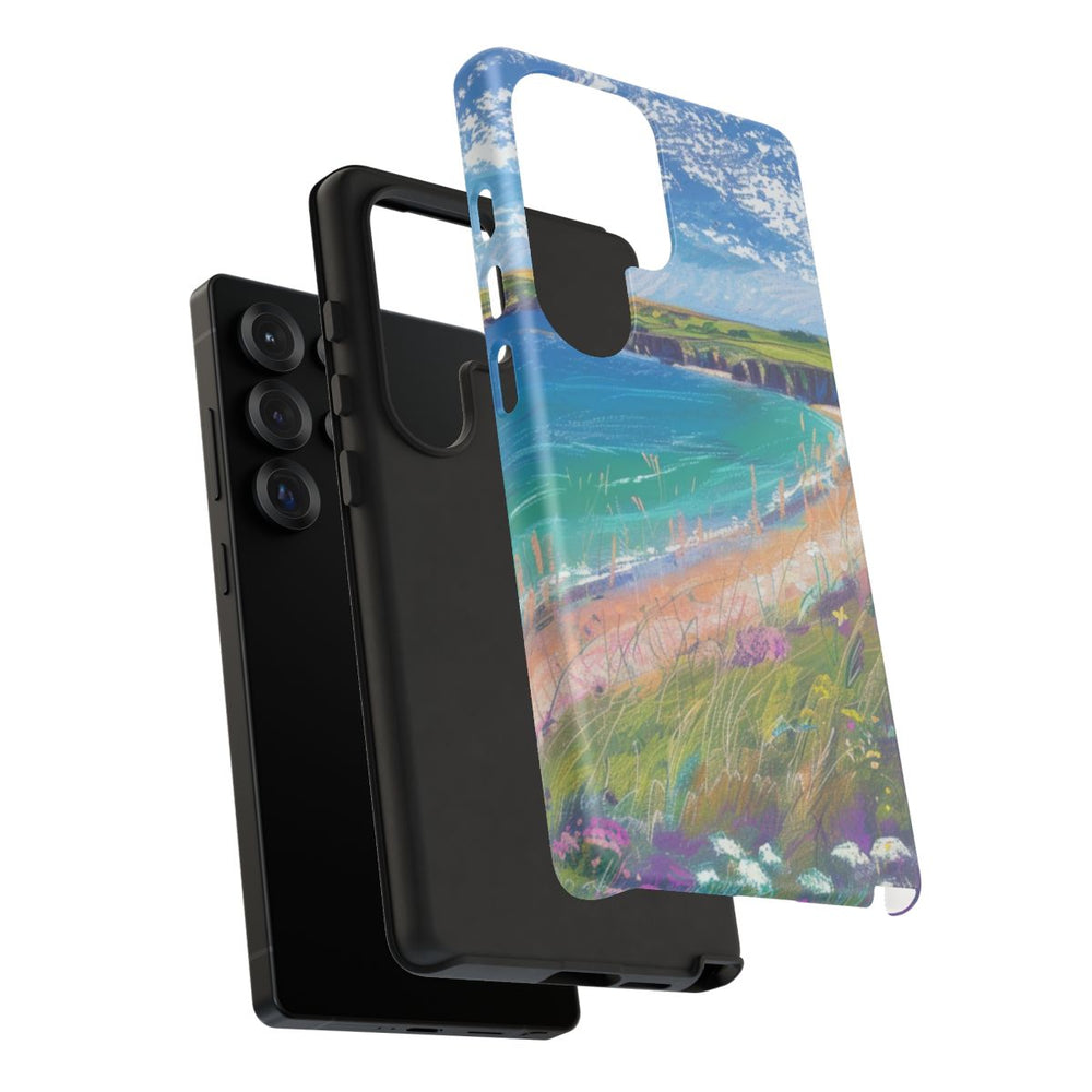 Dit ontwerp toont een levendig kustlandschap met een zandstrand dat sierlijk langs de kustlijn loopt. De zee schittert in tinten blauw en turquoise onder een heldere lucht met verspreide witte wolken. Op de voorgrond staan kleurrijke wilde bloemen en grassen in paars, wit, geel en groen, wat zorgt voor een vrolijk en natuurlijk geheel. Op de achtergrond zijn kliffen en grasvelden te zien die zich langs de kust uitstrekken. De afbeelding is gedrukt op een stevige, matte hoesje met dubbele laag van polycarbonaat en TPU, wat zorgt voor extra duurzaamheid en bescherming tegen buitenomstandigheden.