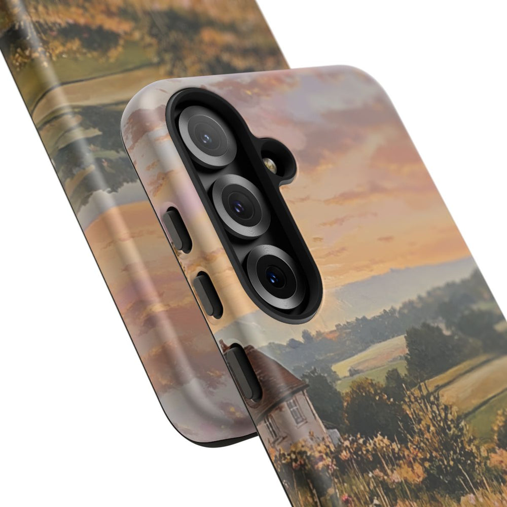 Dit hoesje toont een rustiek landschap in de ochtend met een wit huisje met rood dak aan de linkerkant. Op de voorgrond bloeien roze en paarse wilde bloemen. Op de achtergrond liggen glooiende groene heuvels en verspreide bomen onder een lucht met zachte wolken, verlicht door de opkomende zon. Het matte, stevige hoesje is gemaakt van polycarbonaat en TPU voor extra bescherming en ondersteunt draadloos opladen.