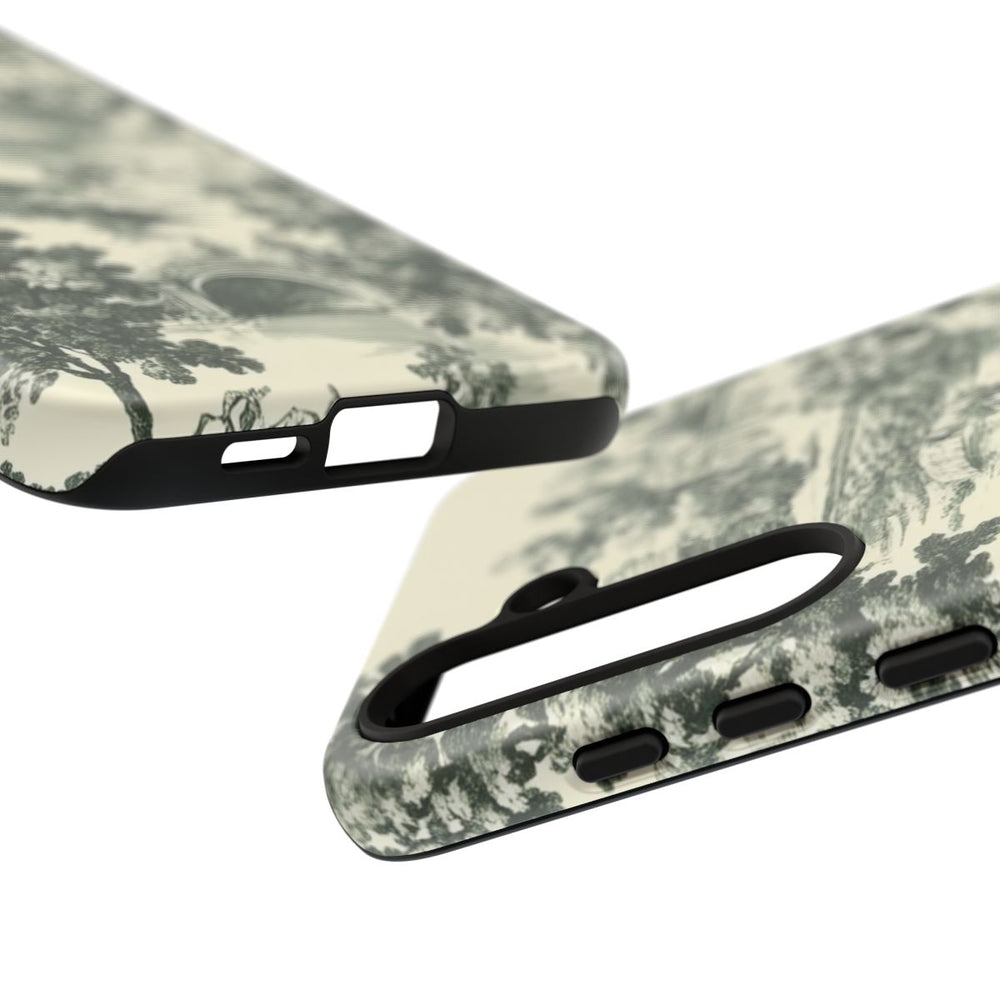 Dit telefoonhoesje is voorzien van een klassiek toile-patroon met gedetailleerde taferelen uit het landelijke leven in groen op een crèmekleurige achtergrond. U ziet onder andere bomen, bruggen, fonteinen, paarden en mensen in historische kleding die verschillende activiteiten uitvoeren. Het patroon is verfijnd en heeft een vintage uitstraling, wat zorgt voor een tijdloze look. Het hoesje bestaat uit twee lagen van polycarbonaat en TPU, waardoor het extra stevig is en geschikt voor draadloos opladen.