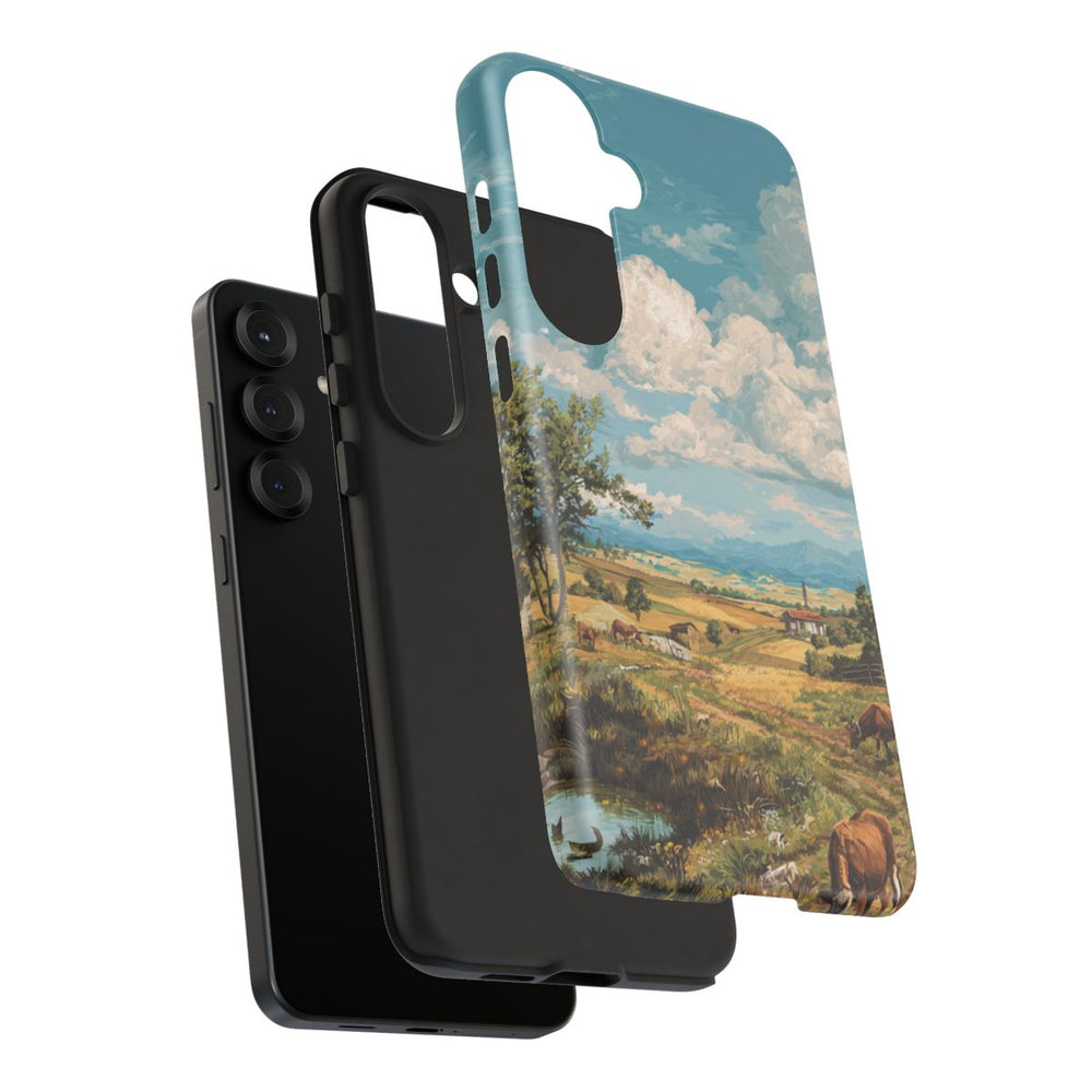 Dit hoesje toont een rustiek landschap met verschillende boerderijdieren, zoals koeien, schapen en eenden bij een kleine vijver. Het tafereel bestaat uit groene weilanden, een zandpad en enkele landelijke gebouwen met pannendaken. Hoge bomen en weelderige begroeiing omringen het gebied, terwijl een heldere blauwe lucht met grote, witte wolken en vliegende vogels extra diepte geeft. Het matte hoesje is gemaakt van stevige materialen en ondersteunt draadloos opladen.