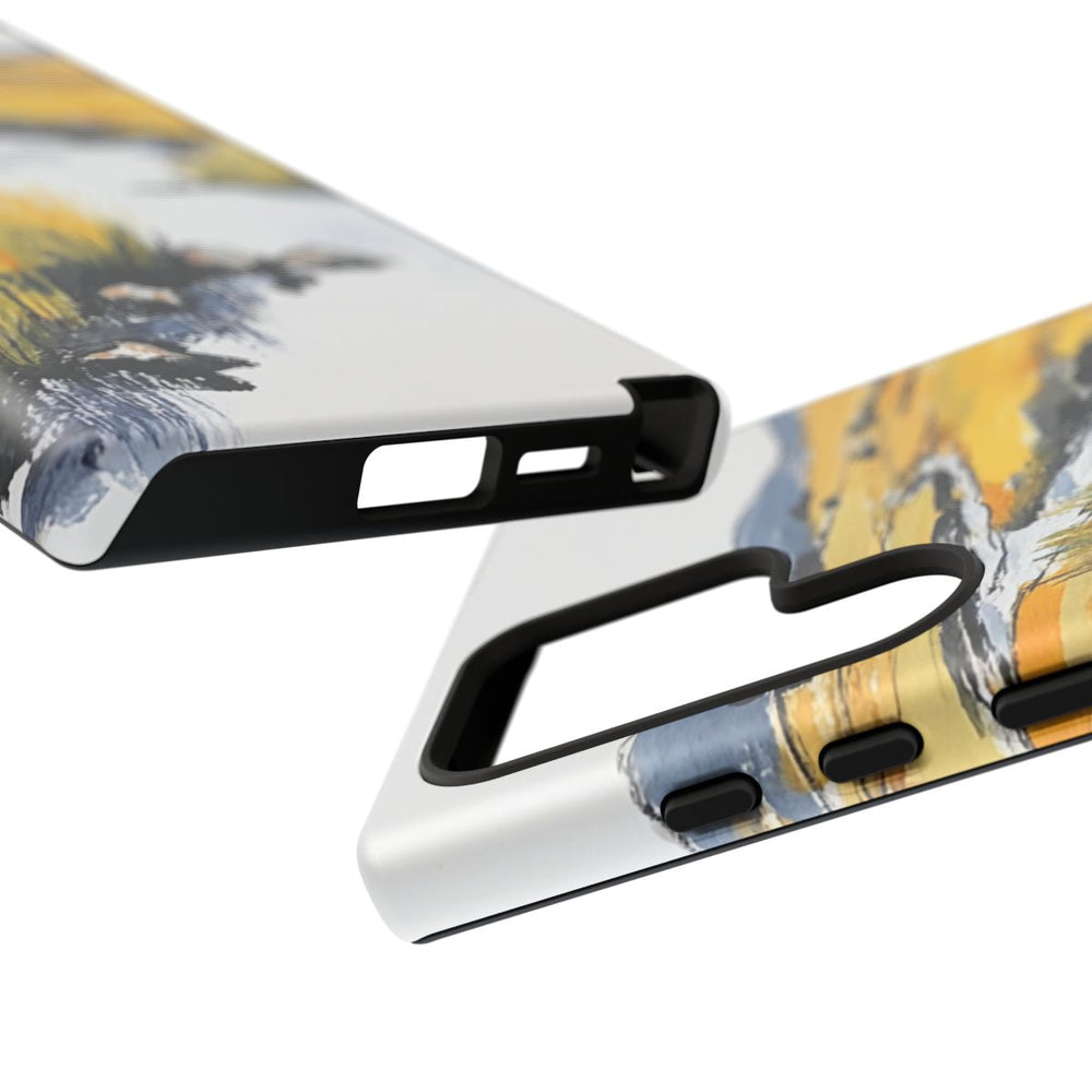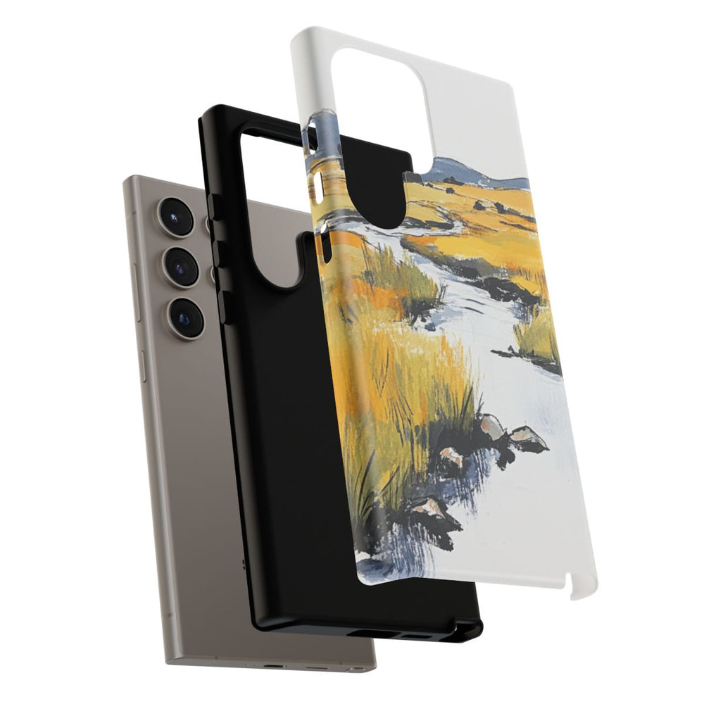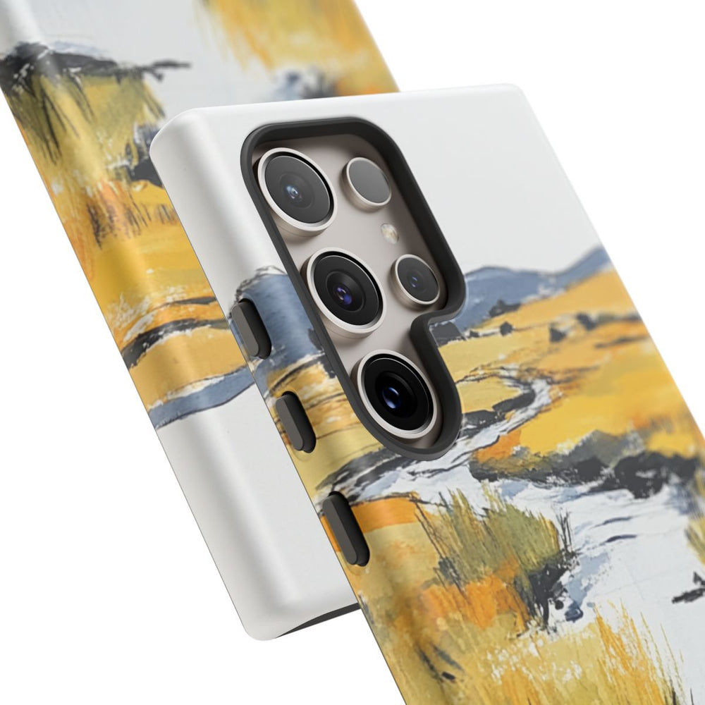 Dit hoesje heeft een speels getekend landschap met een kronkelende beek tussen gele en oranje velden. Langs het water liggen donkere struiken en stenen, met in de verte blauwe heuvels. Het ontwerp is uitgevoerd in een ruwe, schilderachtige stijl met zichtbare penseelstreken en weinig details. Het hoesje bestaat uit twee lagen voor extra stevigheid en is geschikt voor draadloos opladen.