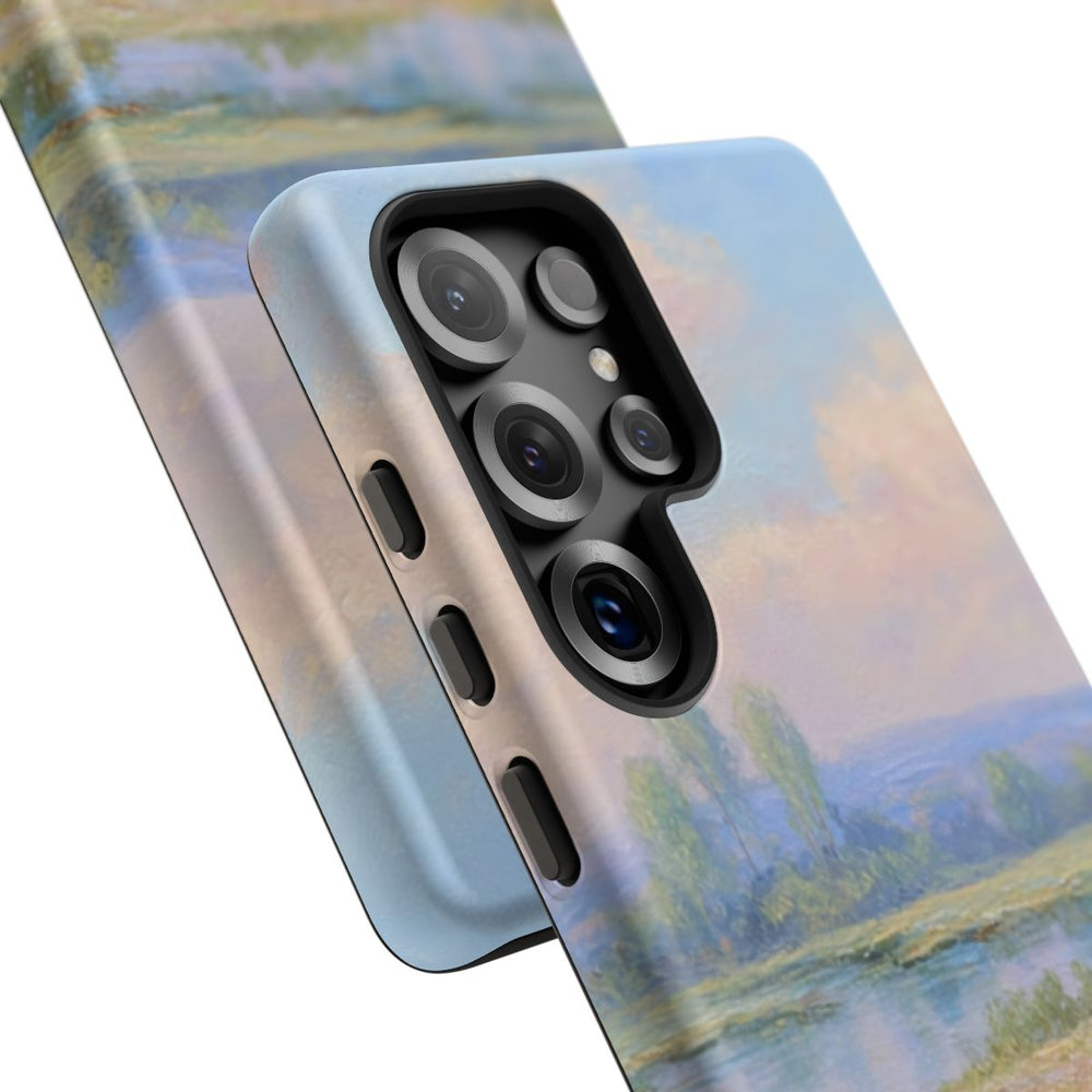Dit hoesje toont een rustgevend landschap met zachtroze kersenbloesembomen aan beide zijden, die een levendige weide vol blauwe, paarse en oranje wilde bloemen omlijsten. Op de achtergrond weerspiegelt een kalme vijver de lichtblauwe lucht met witte wolken. Het ontwerp is geschilderd met lichte, zichtbare penseelstreken en een heldere, sfeervolle kleurencombinatie. Het hoesje bestaat uit twee lagen polycarbonaat en TPU en ondersteunt draadloos opladen.