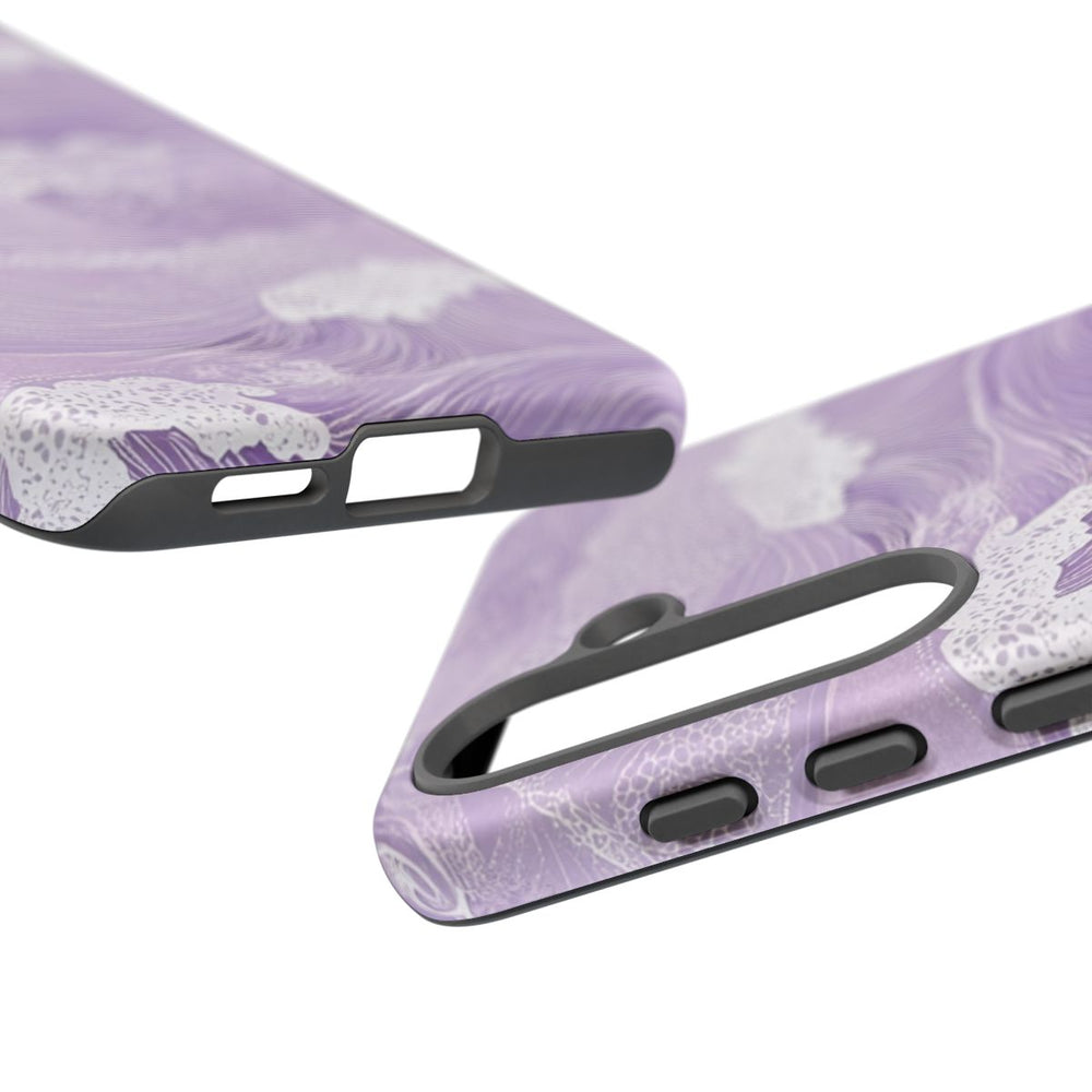 Dit hoesje is voorzien van een naadloos patroon van oceaangolven in zachte lavendeltinten. De golven zijn afgewerkt met verfijnde witte schuimdetails en vloeiende lijnen, wat zorgt voor een sierlijke en elegante uitstraling. Het ontwerp heeft een vintage, textielachtige stijl met een soepele en harmonieuze look. Het hoesje bestaat uit twee lagen, met een matte afwerking, en is vervaardigd van polycarbonaat met een TPU-binnenkant voor extra bescherming. Geschikt voor draadloos opladen.