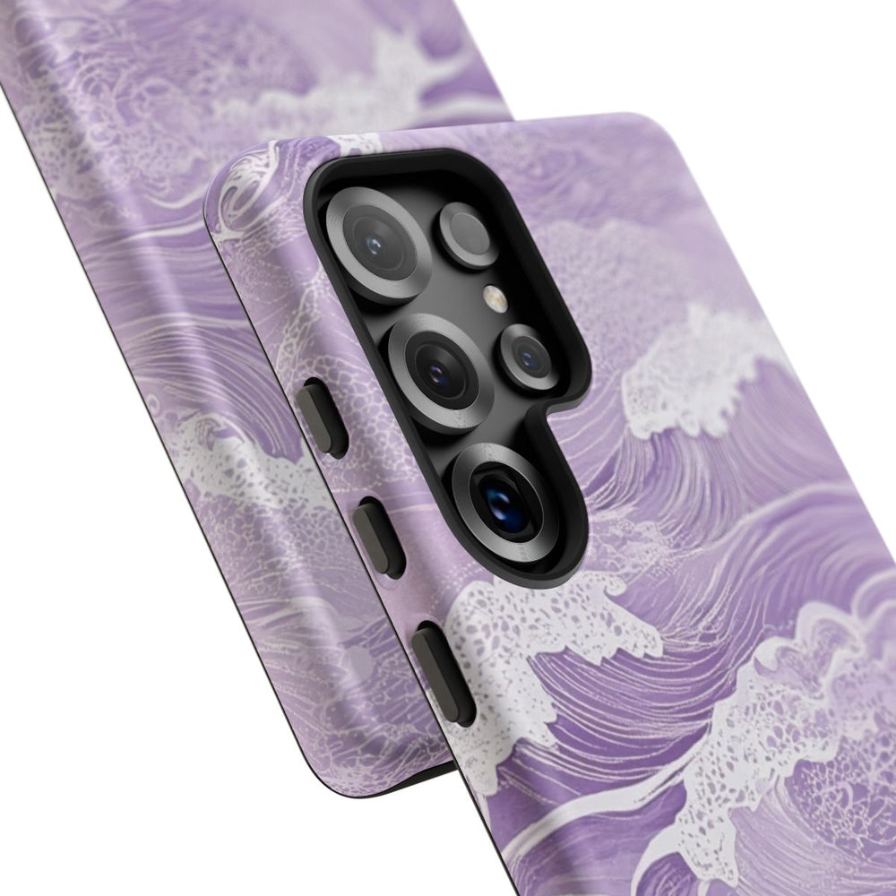 Dit hoesje is voorzien van een naadloos patroon van oceaangolven in verschillende tinten lavendel en lichtpaars. De golven zijn afgewerkt met verfijnde, vloeiende lijnen en witte schuimkoppen, wat zorgt voor een zachte en elegante uitstraling. Het patroon heeft een subtiele, textuurachtige look met fijne details die doen denken aan kant of luchtbellen. Het matte, stevige hoesje bestaat uit twee lagen van polycarbonaat en TPU en biedt optimale bescherming en duurzaamheid. Geschikt voor draadloos opladen.