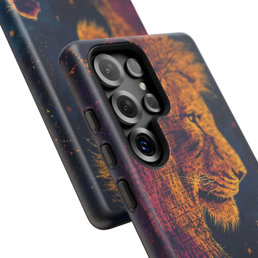 Dit hoesje toont een grote leeuwenkop die naar een klein meisje kijkt, staand in een bloemenveld. Beide figuren zijn opgevuld met textuurpatronen die doen denken aan krantenpapier. Op de achtergrond zie je een diepe blauwe nachtelijke hemel met verspreide, gloeiende lichtpuntjes die doen denken aan vuurvliegjes of sterren. Het meisje draagt een jurkje en kijkt omhoog naar de leeuw, wat een gevoel van verwondering en verbondenheid oproept. Het hoesje bestaat uit twee lagen: een stevige polycarbonaat buitenkant en een TPU binnenzijde. Ondersteunt draadloos opladen.
