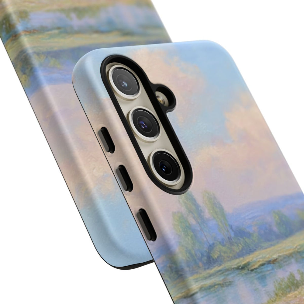 Dit ontwerp toont een rustig lentelandschap met zachtroze kersenbloesembomen aan beide zijden. Op de voorgrond staat een kleurrijke weide vol blauwe, paarse en oranje wilde bloemen. In het midden ligt een kalme vijver die de lichtblauwe lucht met witte wolken weerspiegelt. Op de achtergrond lopen de heuvels over in lichtgroene bomen. De afbeelding is gedrukt op een matte, stevige telefoonhoes met dubbele laag, geschikt voor de Galaxy S24 Plus.