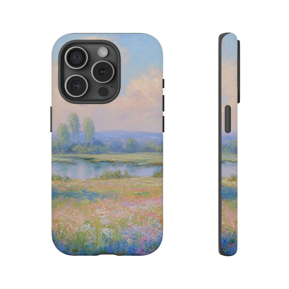 Dit telefoonhoesje toont een sfeervol lentelandschap met zachtroze kersenbloesembomen aan beide zijden. Op de voorgrond zie je een weide vol blauwe, paarse en oranje wilde bloemen. Een rustige vijver weerspiegelt de lichtblauwe lucht met witte wolken op de achtergrond. Het ontwerp is uitgevoerd in een impressionistische stijl met lichte, textuurrijke penseelstreken. Het stevige hoesje bestaat uit twee lagen van polycarbonaat en TPU en ondersteunt draadloos opladen.