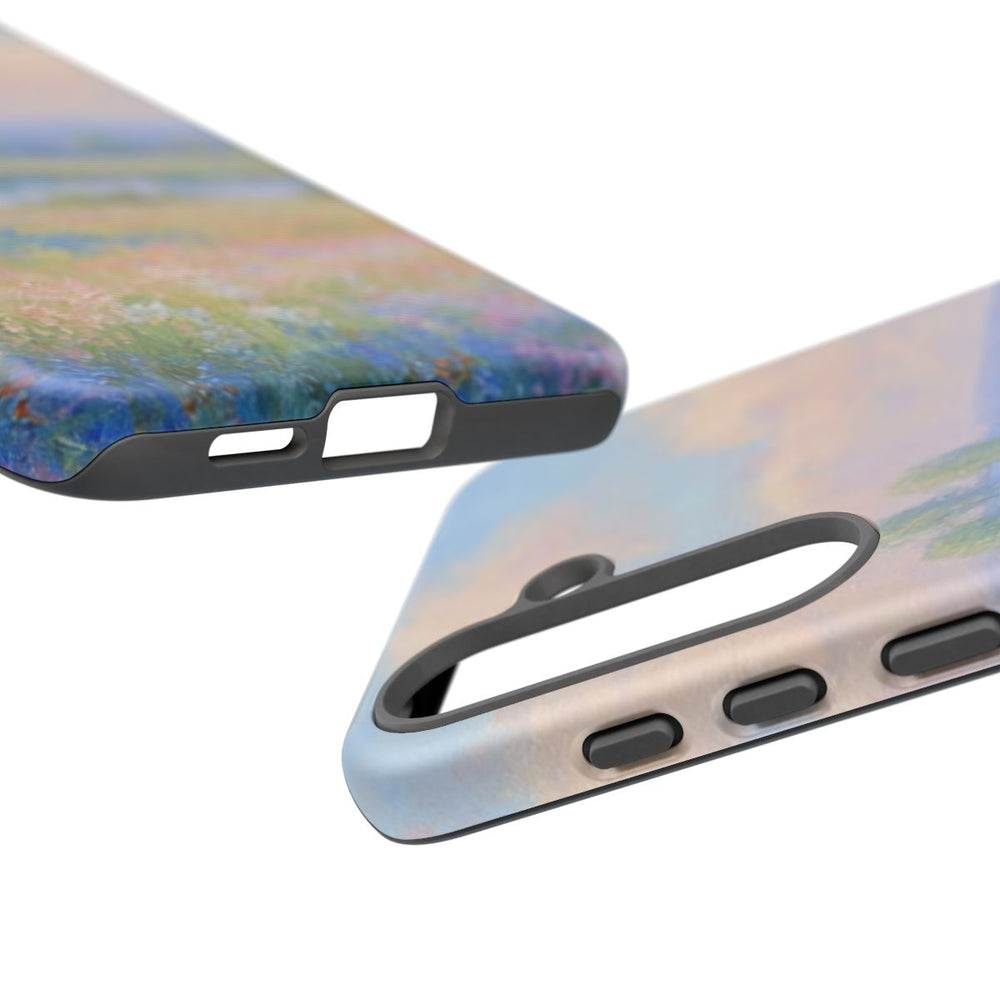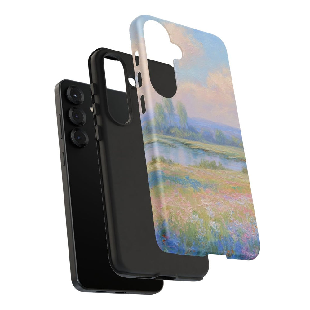 Dit hoesje heeft een rustgevend lentelandschap met zachtroze kersenbloesembomen aan beide zijden. Op de voorgrond zie je een weelderige weide vol blauwe, paarse en oranje wilde bloemen. Een kalme vijver weerspiegelt de lichtblauwe lucht met witte wolken. Op de achtergrond zijn in de verte bomen en heuvels zichtbaar onder een heldere, zachte hemel. Het hoesje bestaat uit twee lagen: een stevige polycarbonaat buitenkant en een TPU binnenzijde. Geschikt voor draadloos opladen.