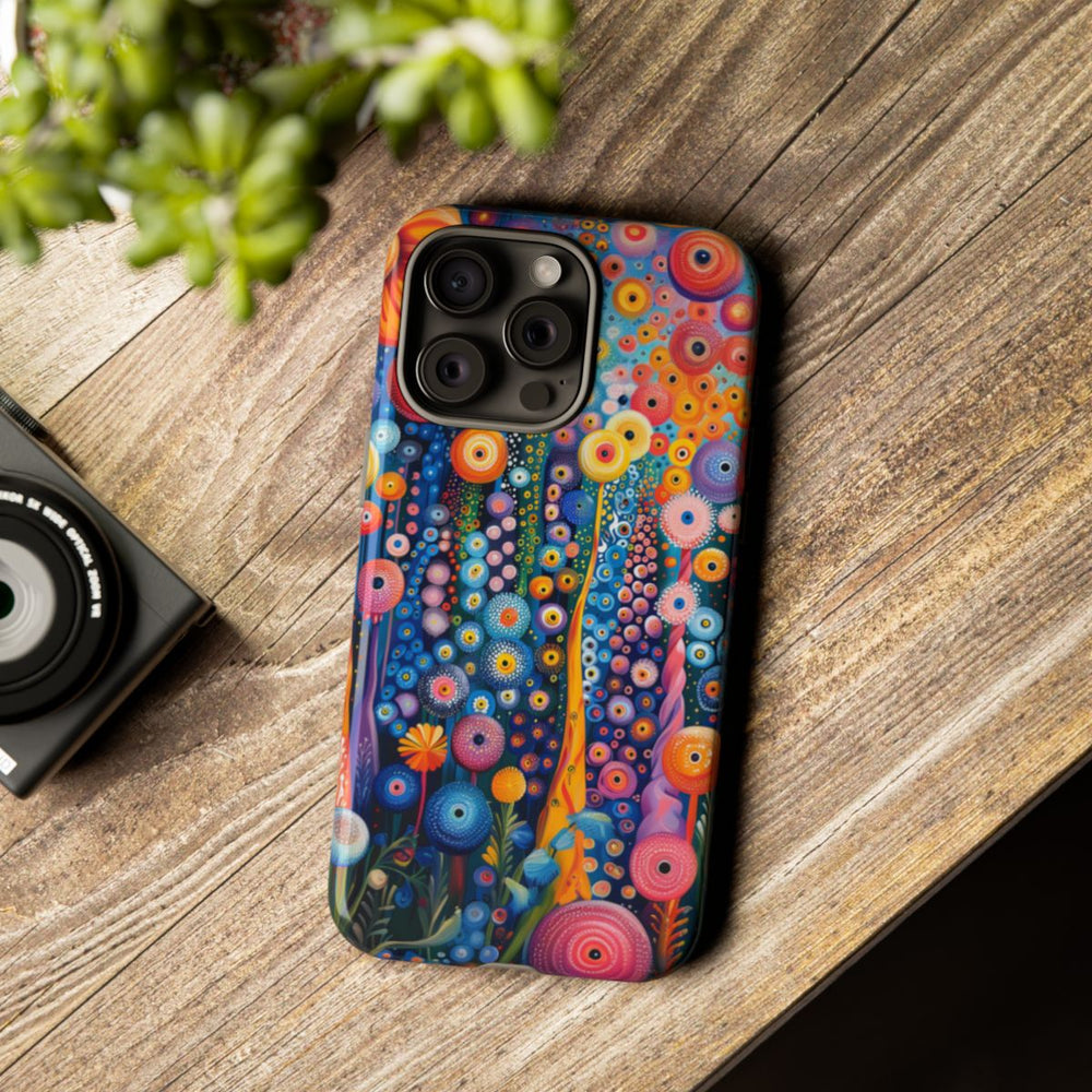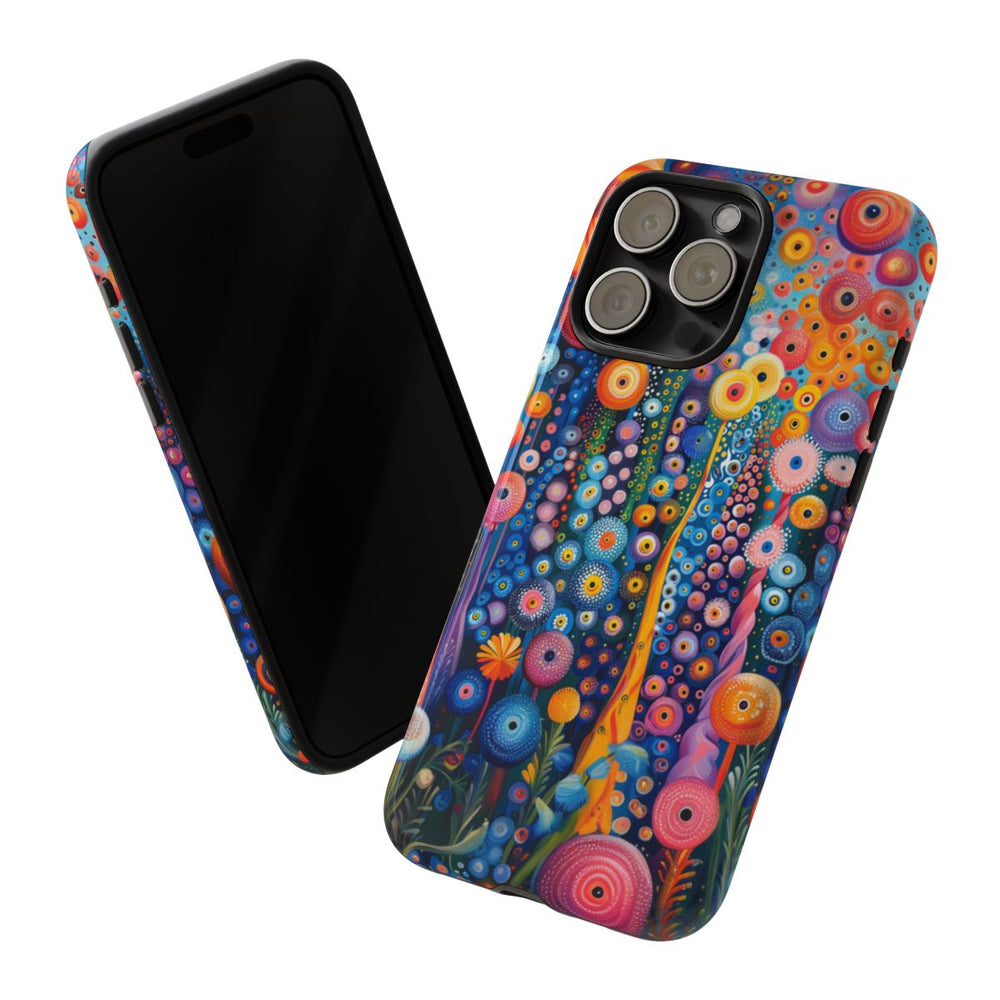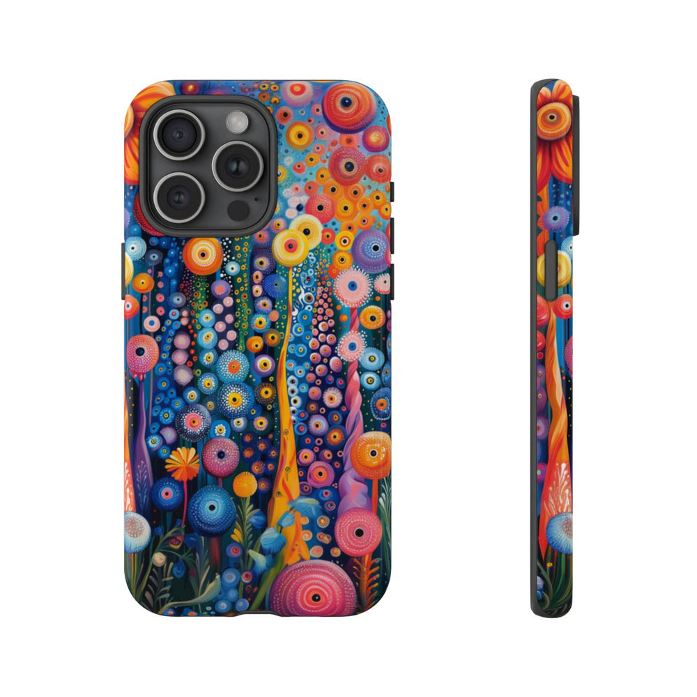 Dit ontwerp heeft een opvallend en kleurrijk abstract bloemenpatroon met grote, feloranje bloemen en talloze kleinere, ronde vormen in tinten oranje, roze, blauw en paars. De achtergrond is overwegend diepblauw, wat zorgt voor een krachtig contrast met de warme kleuren van de bloemen. Het patroon straalt een speelse, bijna magische sfeer uit door de zachte schaduwen en verfijnde details. Dit glanzende, stevige hoesje is gemaakt van polycarbonaat en TPU en biedt zowel duurzaamheid als ondersteuning voor draadloos opladen.