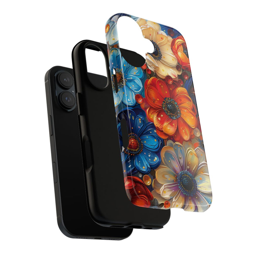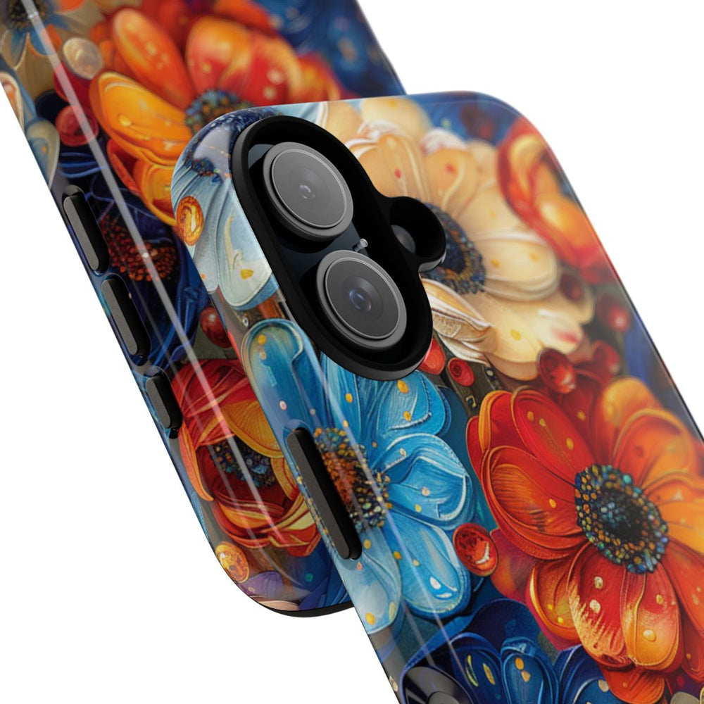 Dit hoesje heeft een levendig en gedetailleerd patroon van abstracte bloemen in diverse kleuren, zoals blauw, oranje, crème en rood. De bloemen zijn voorzien van verfijnde bloemblaadjes met een geschilderde uitstraling en worden afgewisseld met kleine ronde accenten die voor extra diepte en speelsheid zorgen. Het geheel is dicht en kleurrijk samengesteld, wat een opvallend visueel effect geeft. Het hoesje heeft een glanzende afwerking en een stevige dubbele laag, waardoor het duurzaam is en geschikt voor draadloos opladen en gebruik buitenshuis.