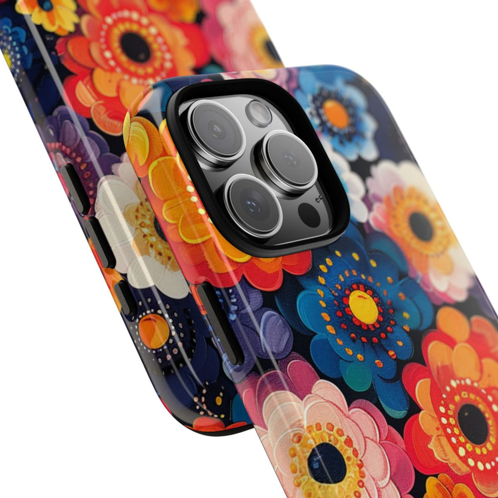 Dit hoesje heeft een opvallend en kleurrijk abstract bloemenpatroon met verschillende grote en kleine bloemen. De bloemen zijn geschilderd in heldere tinten oranje, geel, roze, blauw, paars en rood, elk met gedetailleerde harten en gelaagde bloemblaadjes. De donkere achtergrond laat de felle kleuren extra goed uitkomen. Het patroon is gedrukt op een glanzend en stevig hoesje met een polycarbonaat buitenkant en TPU-binnenzijde, wat zorgt voor extra stevigheid en bescherming. Het hoesje is geschikt voor draadloos opladen en biedt uitstekende weerstand tegen weersinvloeden.