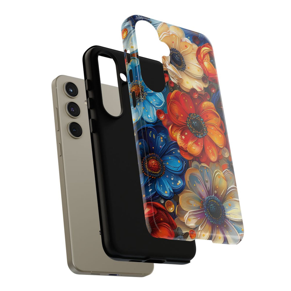 Dit hoesje heeft een levendig en gedetailleerd patroon van abstracte bloemen in diverse kleuren, zoals blauw, oranje, crème en rood. De bloemen zijn voorzien van verfijnde bloemblaadjes met een geschilderde uitstraling en worden afgewisseld met kleine ronde accenten die voor extra diepte en speelsheid zorgen. Het geheel is dicht en kleurrijk samengesteld, wat een opvallend visueel effect geeft. Het hoesje heeft een glanzende afwerking en een stevige dubbele laag, waardoor het duurzaam is en geschikt voor draadloos opladen en gebruik buitenshuis.