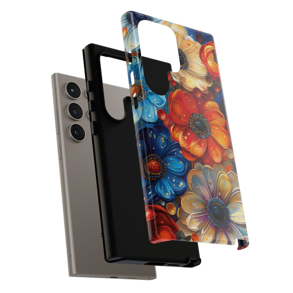 Dit hoesje heeft een levendig en gedetailleerd patroon van abstracte bloemen in diverse kleuren, zoals blauw, oranje, crème en rood. De bloemen zijn voorzien van verfijnde bloemblaadjes met een geschilderde uitstraling en worden afgewisseld met kleine ronde accenten die voor extra diepte en speelsheid zorgen. Het geheel is dicht en kleurrijk samengesteld, wat een opvallend visueel effect geeft. Het hoesje heeft een glanzende afwerking en een stevige dubbele laag, waardoor het duurzaam is en geschikt voor draadloos opladen en gebruik buitenshuis.