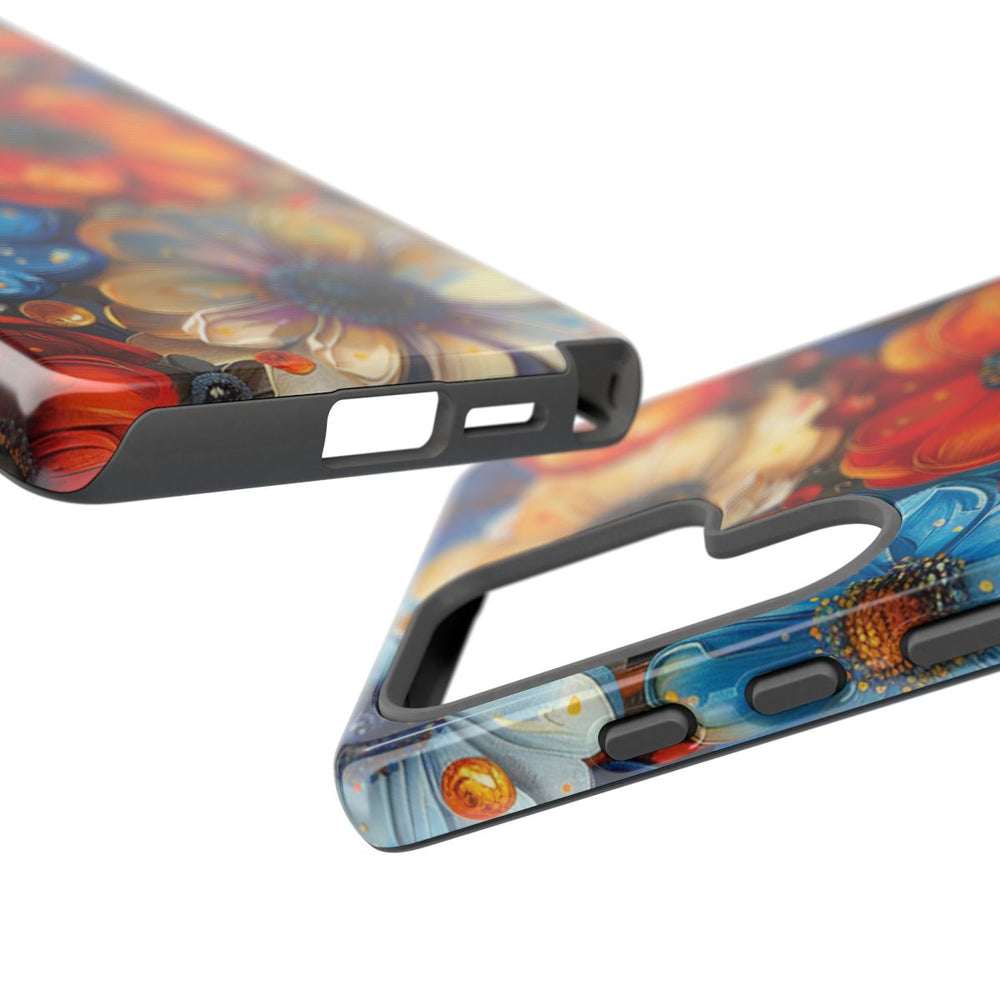 Dit hoesje heeft een levendig en gedetailleerd patroon van abstracte bloemen in diverse kleuren, zoals blauw, oranje, crème en rood. De bloemen zijn voorzien van verfijnde bloemblaadjes met een geschilderde uitstraling en worden afgewisseld met kleine ronde accenten die voor extra diepte en speelsheid zorgen. Het geheel is dicht en kleurrijk samengesteld, wat een opvallend visueel effect geeft. Het hoesje heeft een glanzende afwerking en een stevige dubbele laag, waardoor het duurzaam is en geschikt voor draadloos opladen en gebruik buitenshuis.