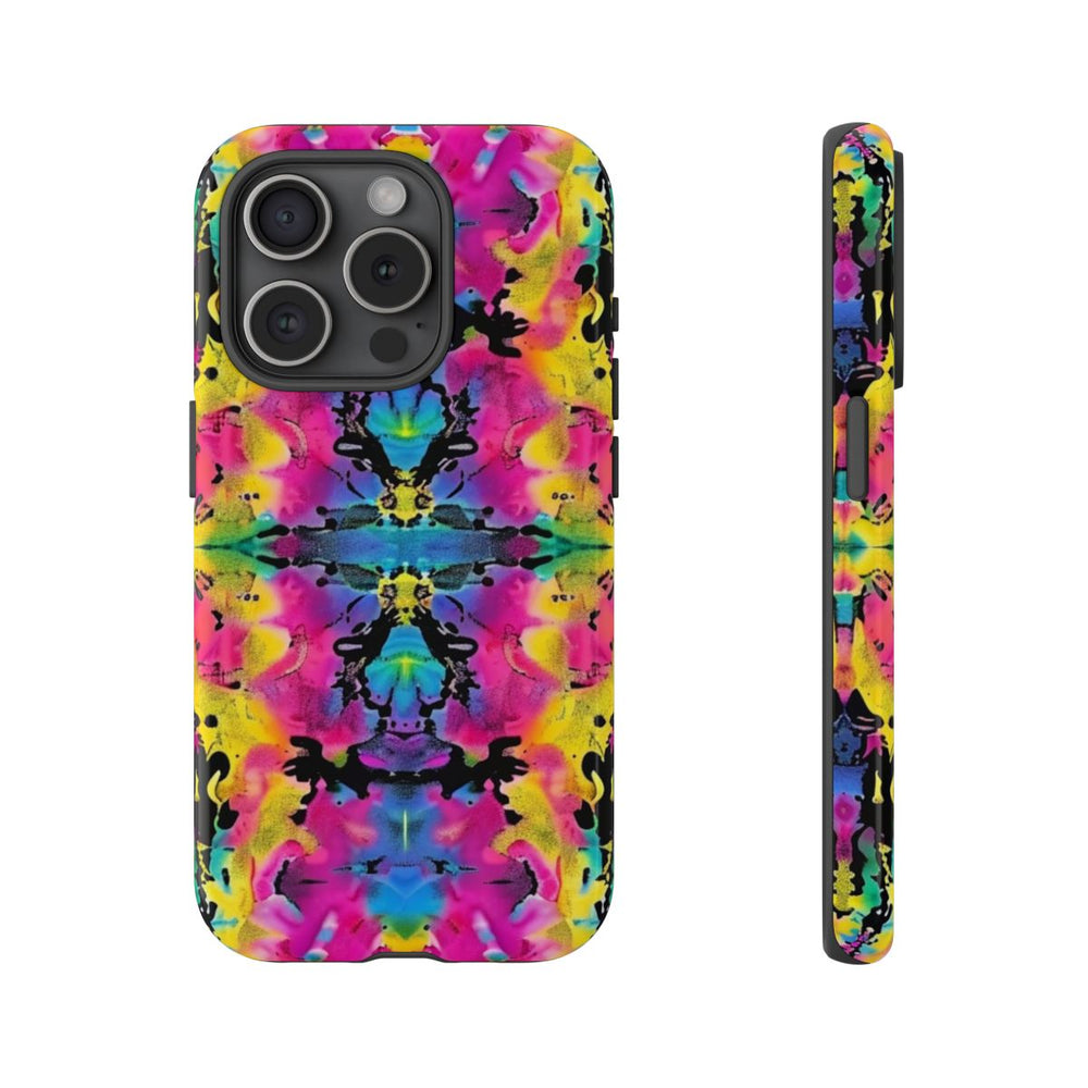 Dit hoesje heeft een opvallend abstract patroon met een symmetrisch, caleidoscopisch effect. Heldere kleuren zoals roze, geel, blauw, groen en zwart vloeien dynamisch samen en zorgen voor een krachtig contrast over het hele oppervlak. Het patroon herhaalt zich als een mozaïek, wat een energieke en unieke uitstraling geeft. Het hoesje is glanzend en stevig, gemaakt van polycarbonaat en TPU, en biedt dubbele bescherming. Daarnaast ondersteunt het draadloos opladen. Dankzij de levendige kleuren en het abstracte ontwerp valt dit hoesje direct op.