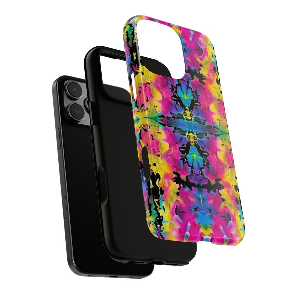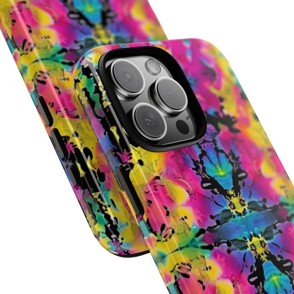 Dit hoesje heeft een opvallend abstract patroon met een symmetrisch, caleidoscopisch effect. Heldere kleuren zoals roze, geel, blauw, groen en zwart vloeien dynamisch samen en zorgen voor een krachtig contrast over het hele oppervlak. Het patroon herhaalt zich als een mozaïek, wat een energieke en unieke uitstraling geeft. Het hoesje is glanzend en stevig, gemaakt van polycarbonaat en TPU, en biedt dubbele bescherming. Daarnaast ondersteunt het draadloos opladen. Dankzij de levendige kleuren en het abstracte ontwerp valt dit hoesje direct op.