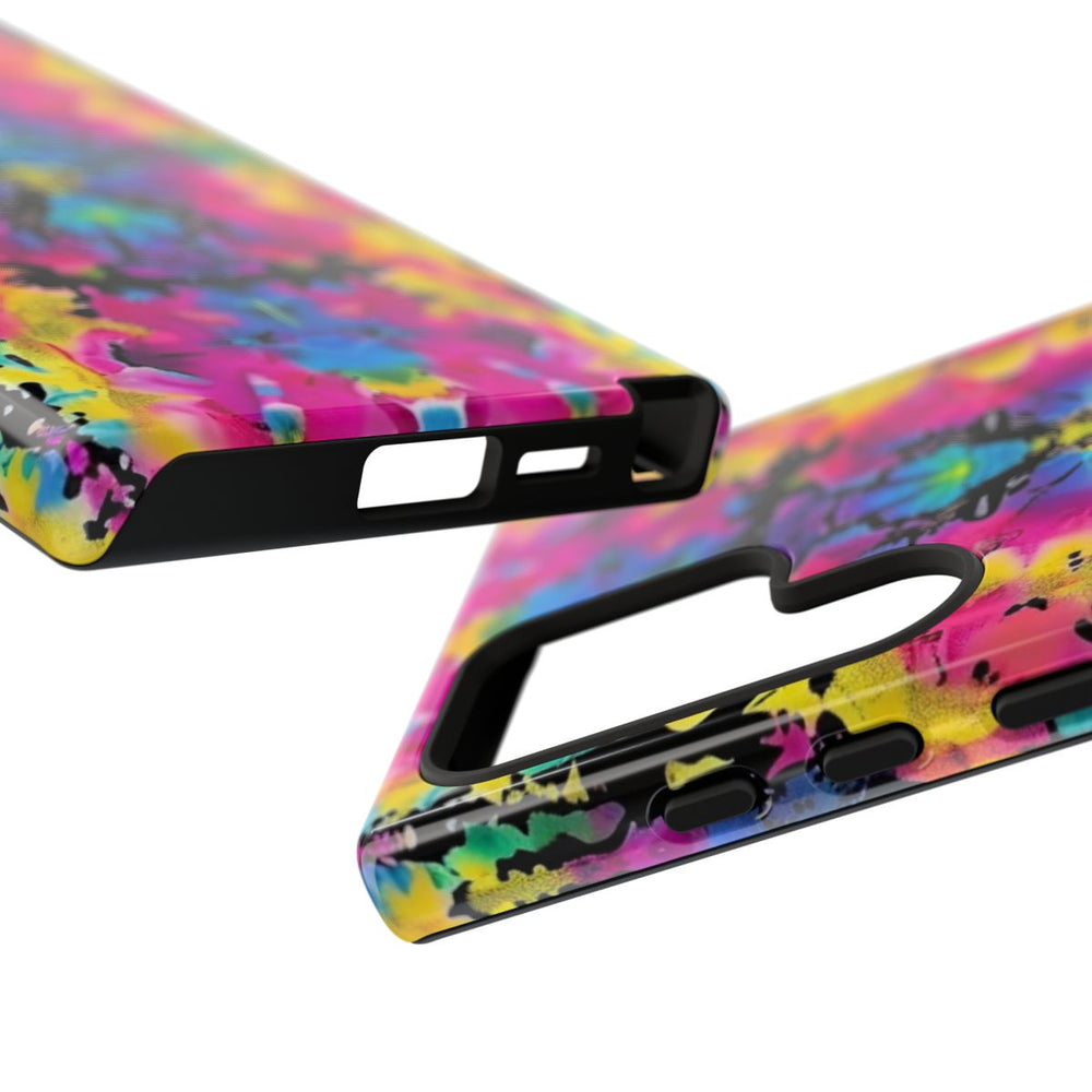 Dit hoesje heeft een opvallend abstract patroon met een symmetrisch, caleidoscopisch effect. Heldere kleuren zoals roze, geel, blauw, groen en zwart vloeien dynamisch samen en zorgen voor een krachtig contrast over het hele oppervlak. Het patroon herhaalt zich als een mozaïek, wat een energieke en unieke uitstraling geeft. Het hoesje is glanzend en stevig, gemaakt van polycarbonaat en TPU, en biedt dubbele bescherming. Daarnaast ondersteunt het draadloos opladen. Dankzij de levendige kleuren en het abstracte ontwerp valt dit hoesje direct op.