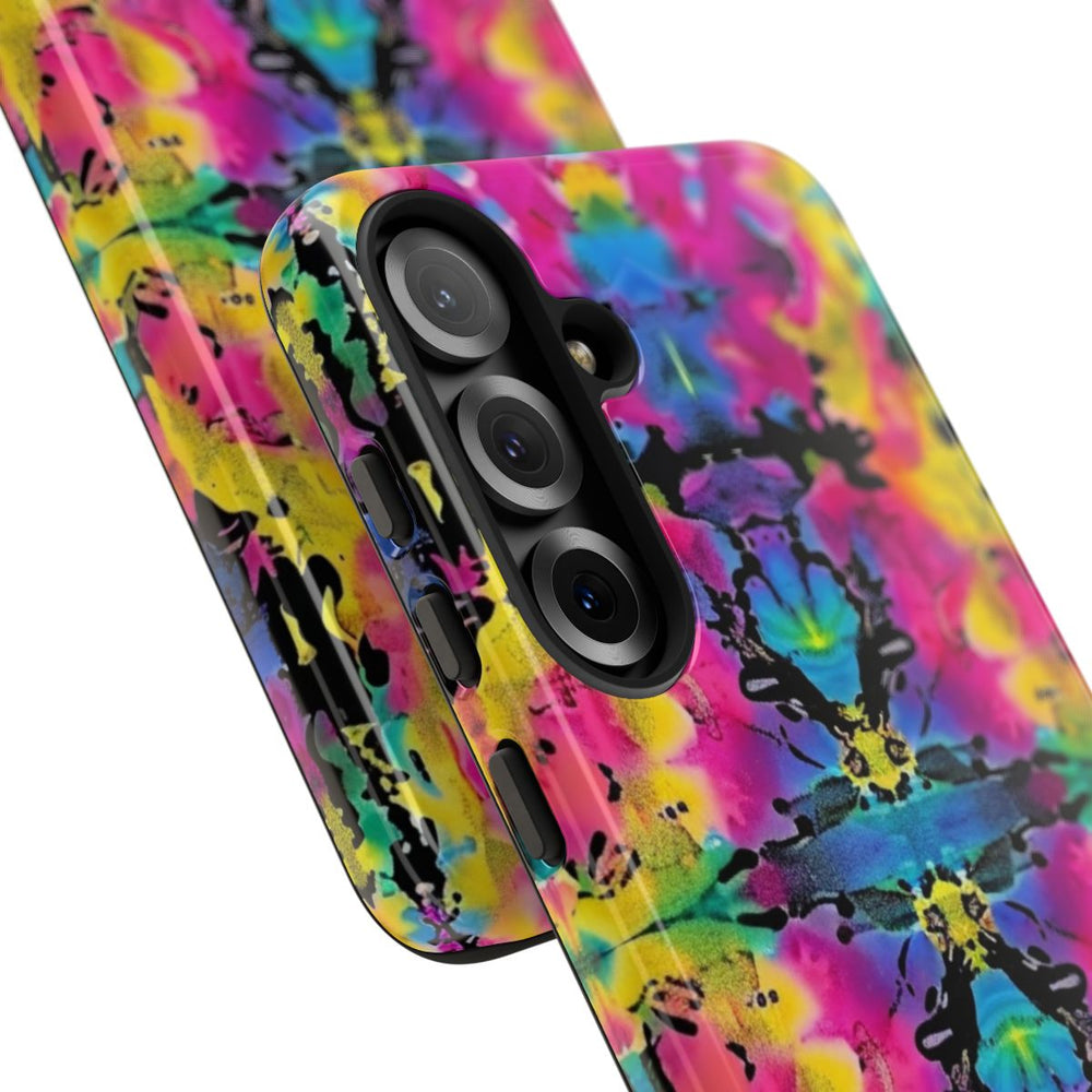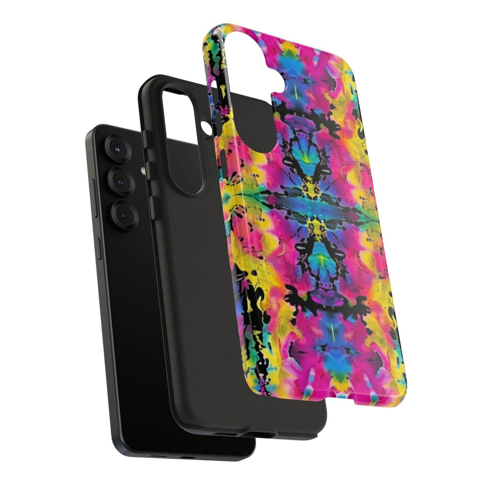 Dit hoesje heeft een opvallend abstract patroon met een symmetrisch, caleidoscopisch effect. Heldere kleuren zoals roze, geel, blauw, groen en zwart vloeien dynamisch samen en zorgen voor een krachtig contrast over het hele oppervlak. Het patroon herhaalt zich als een mozaïek, wat een energieke en unieke uitstraling geeft. Het hoesje is glanzend en stevig, gemaakt van polycarbonaat en TPU, en biedt dubbele bescherming. Daarnaast ondersteunt het draadloos opladen. Dankzij de levendige kleuren en het abstracte ontwerp valt dit hoesje direct op.