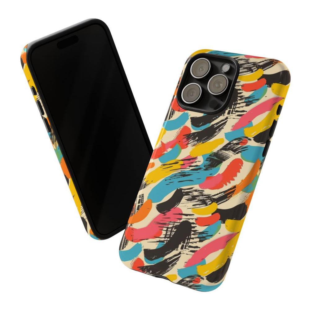 Dit hoesje heeft een abstract patroon met dynamische penseelstrepen in levendige kleuren zoals geel, oranje, roze, blauw en zwart op een beige achtergrond. De penseelstrepen verschillen in grootte en vorm, wat zorgt voor een speels en energiek geheel. Het patroon is gedrukt op een glanzend, stevig hoesje met een dubbele laag van een polycarbonaat buitenkant en een TPU binnenzijde voor extra stevigheid en bescherming. Het hoesje ondersteunt draadloos opladen en is bestand tegen invloeden van buitenaf.