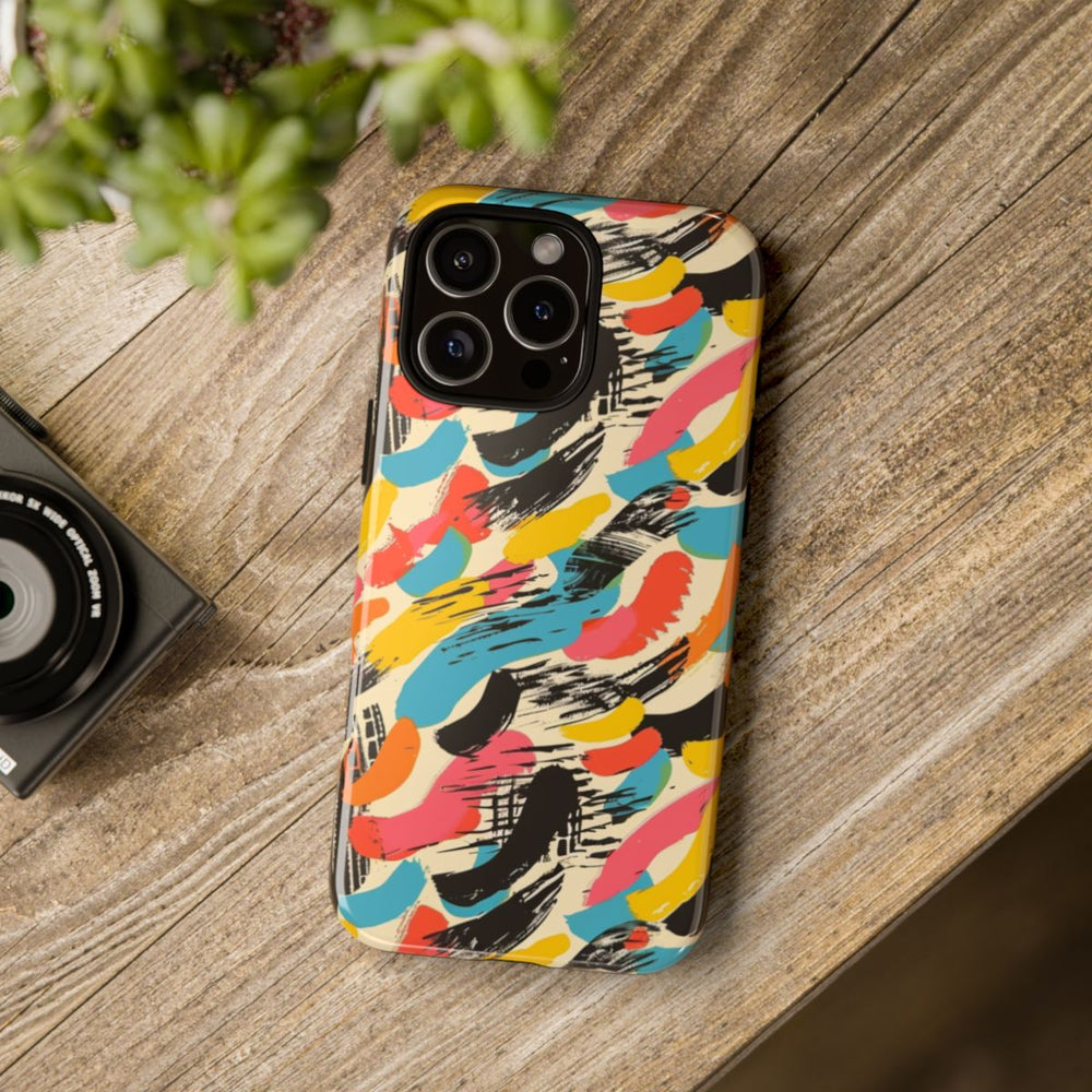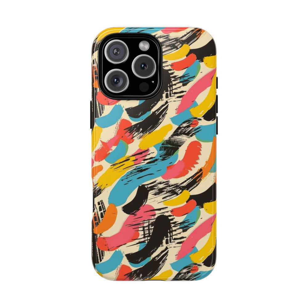 Dit hoesje heeft een abstract patroon met dynamische penseelstrepen in levendige kleuren zoals geel, oranje, roze, blauw en zwart op een beige achtergrond. De penseelstrepen verschillen in grootte en vorm, wat zorgt voor een speels en energiek geheel. Het patroon is gedrukt op een glanzend, stevig hoesje met een dubbele laag van een polycarbonaat buitenkant en een TPU binnenzijde voor extra stevigheid en bescherming. Het hoesje ondersteunt draadloos opladen en is bestand tegen invloeden van buitenaf.