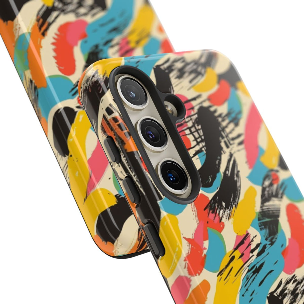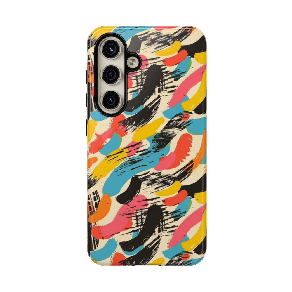 Dit hoesje heeft een abstract patroon met dynamische penseelstrepen in levendige kleuren zoals geel, oranje, roze, blauw en zwart op een beige achtergrond. De penseelstrepen verschillen in grootte en vorm, wat zorgt voor een speels en energiek geheel. Het patroon is gedrukt op een glanzend, stevig hoesje met een dubbele laag van een polycarbonaat buitenkant en een TPU binnenzijde voor extra stevigheid en bescherming. Het hoesje ondersteunt draadloos opladen en is bestand tegen invloeden van buitenaf.
