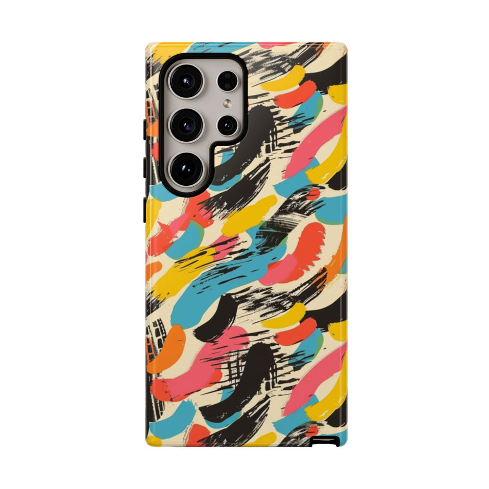 Dit hoesje heeft een abstract patroon met dynamische penseelstrepen in levendige kleuren zoals geel, oranje, roze, blauw en zwart op een beige achtergrond. De penseelstrepen verschillen in grootte en vorm, wat zorgt voor een speels en energiek geheel. Het patroon is gedrukt op een glanzend, stevig hoesje met een dubbele laag van een polycarbonaat buitenkant en een TPU binnenzijde voor extra stevigheid en bescherming. Het hoesje ondersteunt draadloos opladen en is bestand tegen invloeden van buitenaf.