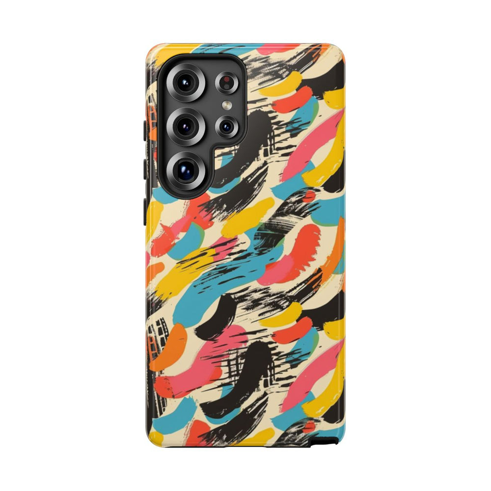 Dit hoesje heeft een abstract patroon met dynamische penseelstrepen in levendige kleuren zoals geel, oranje, roze, blauw en zwart op een beige achtergrond. De penseelstrepen verschillen in grootte en vorm, wat zorgt voor een speels en energiek geheel. Het patroon is gedrukt op een glanzend, stevig hoesje met een dubbele laag van een polycarbonaat buitenkant en een TPU binnenzijde voor extra stevigheid en bescherming. Het hoesje ondersteunt draadloos opladen en is bestand tegen invloeden van buitenaf.