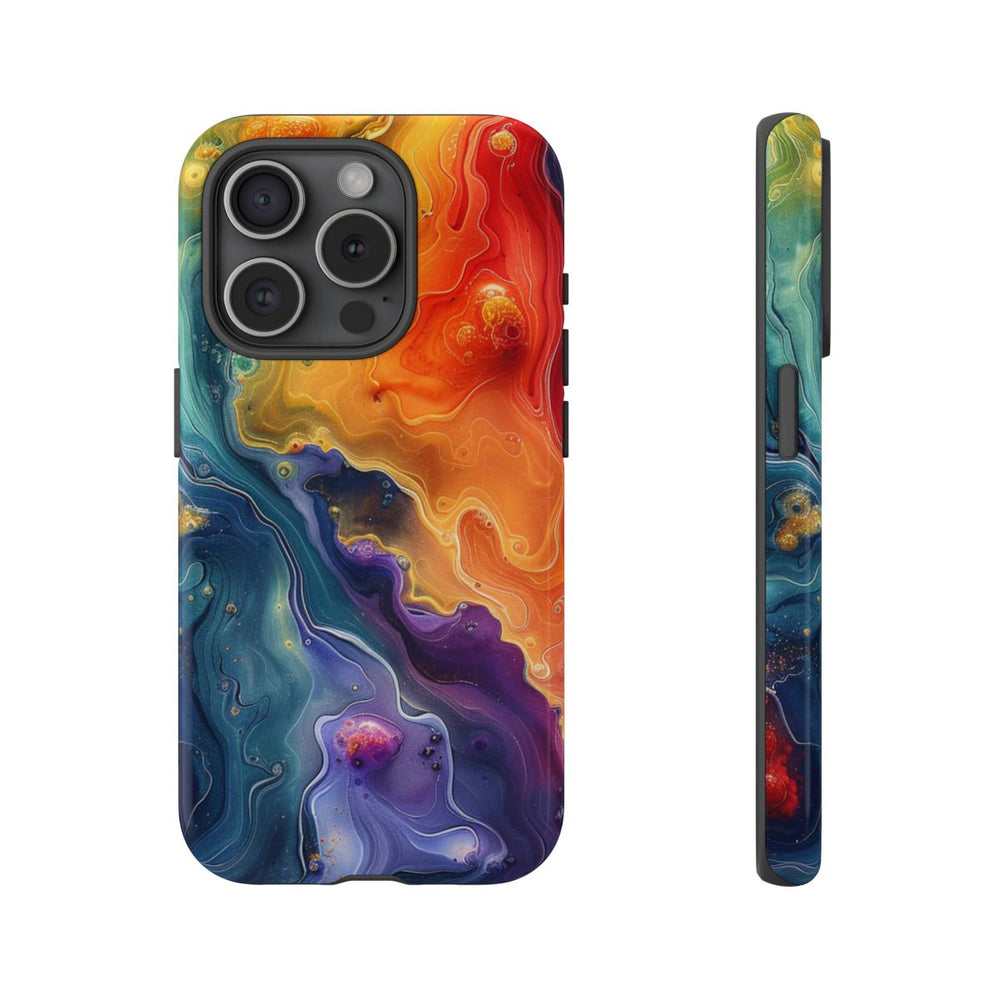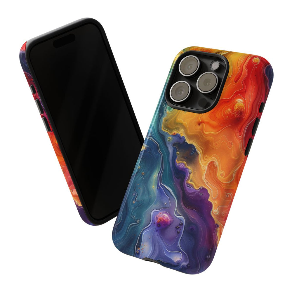Dit hoesje heeft een opvallend abstract patroon geïnspireerd op vloeibare kunst, waarin wervelende kleuren naadloos in elkaar overlopen. Diepblauw, intens paars, vurig rood en helder geel vormen samen een dynamisch en energiek geheel. Het ontwerp kenmerkt zich door een organische, vloeiende uitstraling met verfijnde details en subtiele textuurverschillen. De afbeelding is aangebracht op een glanzend, stevig hoesje met een polycarbonaat buitenkant en een TPU binnenzijde. Dit zorgt voor een dubbele beschermlaag en ondersteunt draadloos opladen.