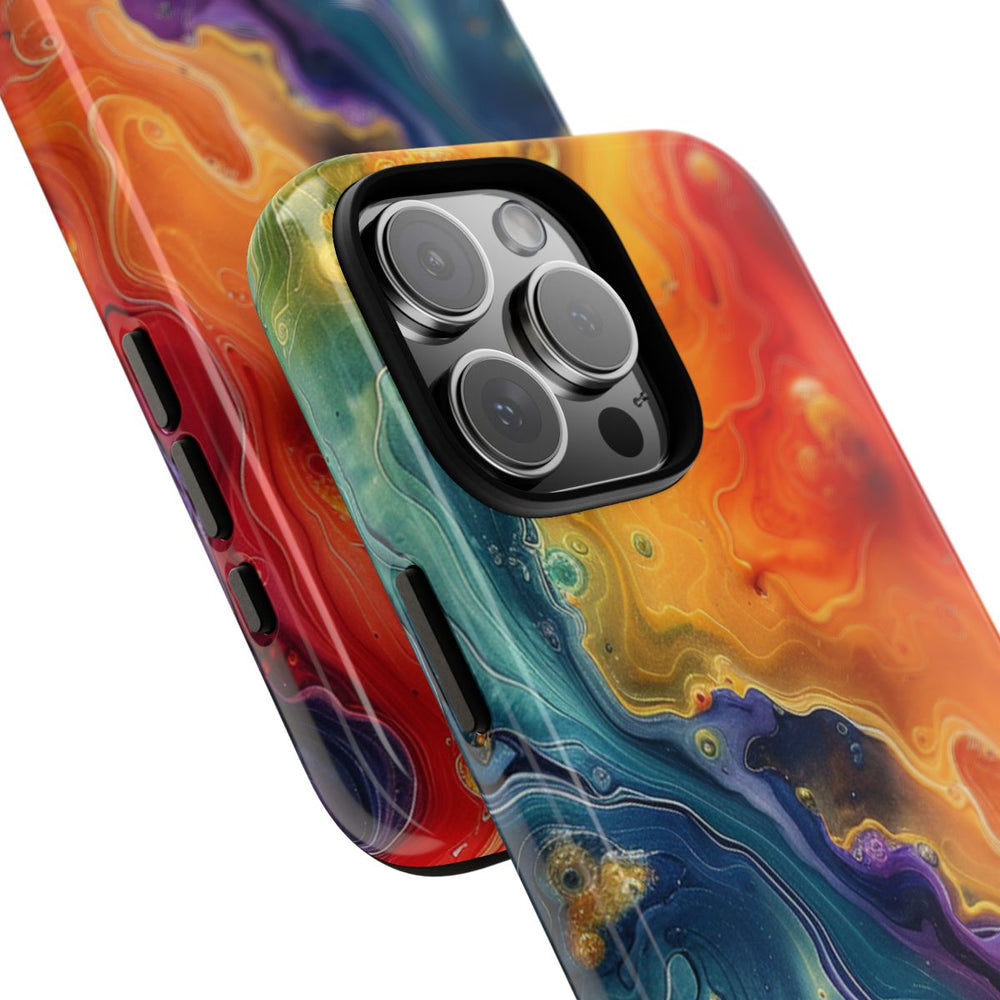 Dit hoesje heeft een opvallend abstract patroon geïnspireerd op vloeibare kunst, waarin wervelende kleuren naadloos in elkaar overlopen. Diepblauw, intens paars, vurig rood en helder geel vormen samen een dynamisch en energiek geheel. Het ontwerp kenmerkt zich door een organische, vloeiende uitstraling met verfijnde details en subtiele textuurverschillen. De afbeelding is aangebracht op een glanzend, stevig hoesje met een polycarbonaat buitenkant en een TPU binnenzijde. Dit zorgt voor een dubbele beschermlaag en ondersteunt draadloos opladen.