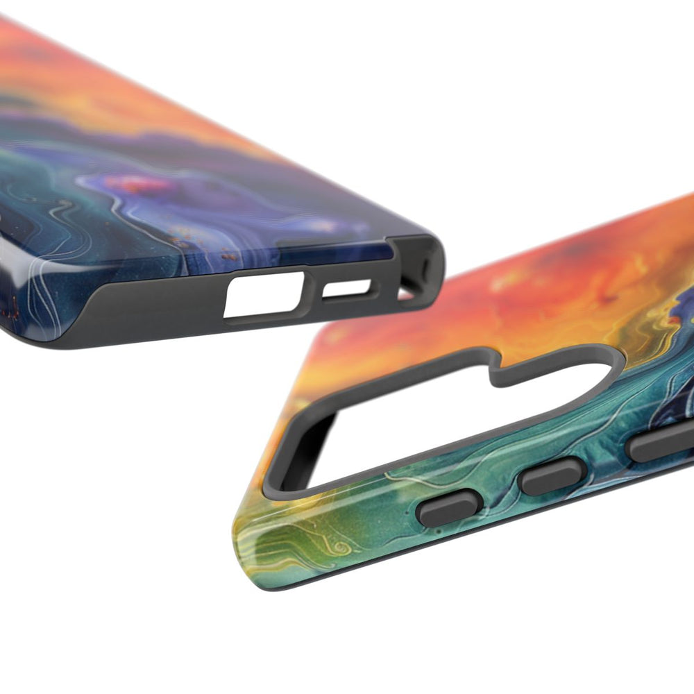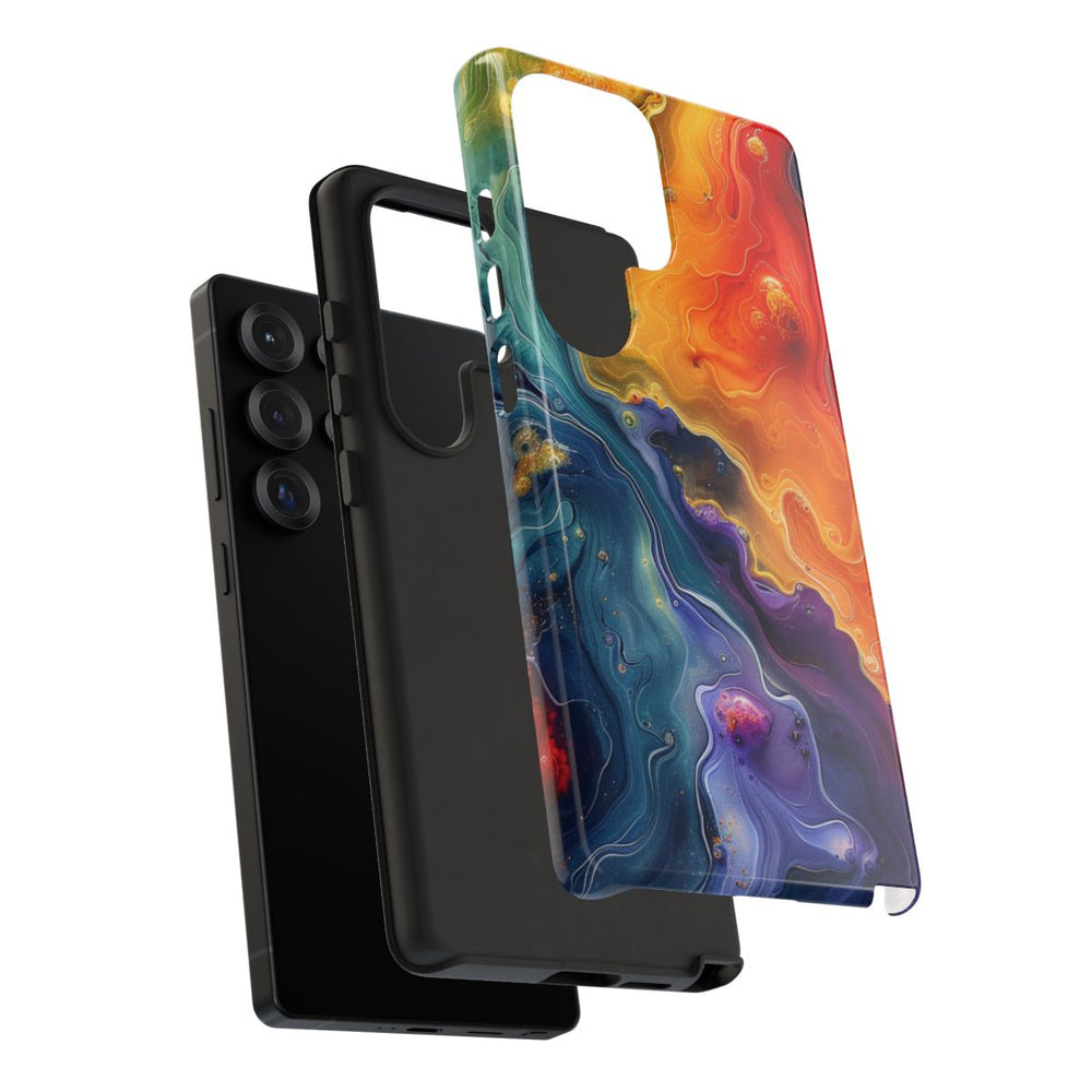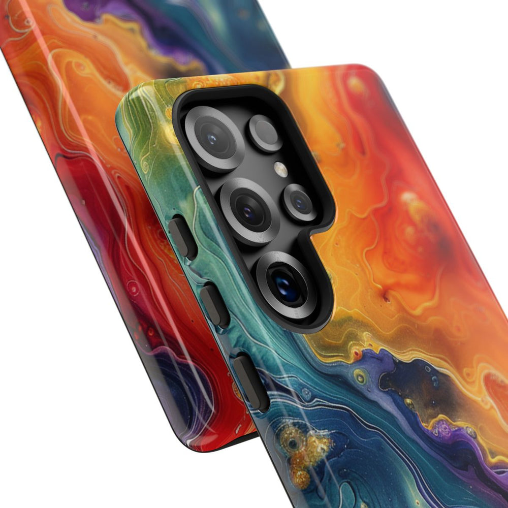 Dit hoesje heeft een opvallend abstract patroon geïnspireerd op vloeibare kunst, waarin wervelende kleuren naadloos in elkaar overlopen. Diepblauw, intens paars, vurig rood en helder geel vormen samen een dynamisch en energiek geheel. Het ontwerp kenmerkt zich door een organische, vloeiende uitstraling met verfijnde details en subtiele textuurverschillen. De afbeelding is aangebracht op een glanzend, stevig hoesje met een polycarbonaat buitenkant en een TPU binnenzijde. Dit zorgt voor een dubbele beschermlaag en ondersteunt draadloos opladen.