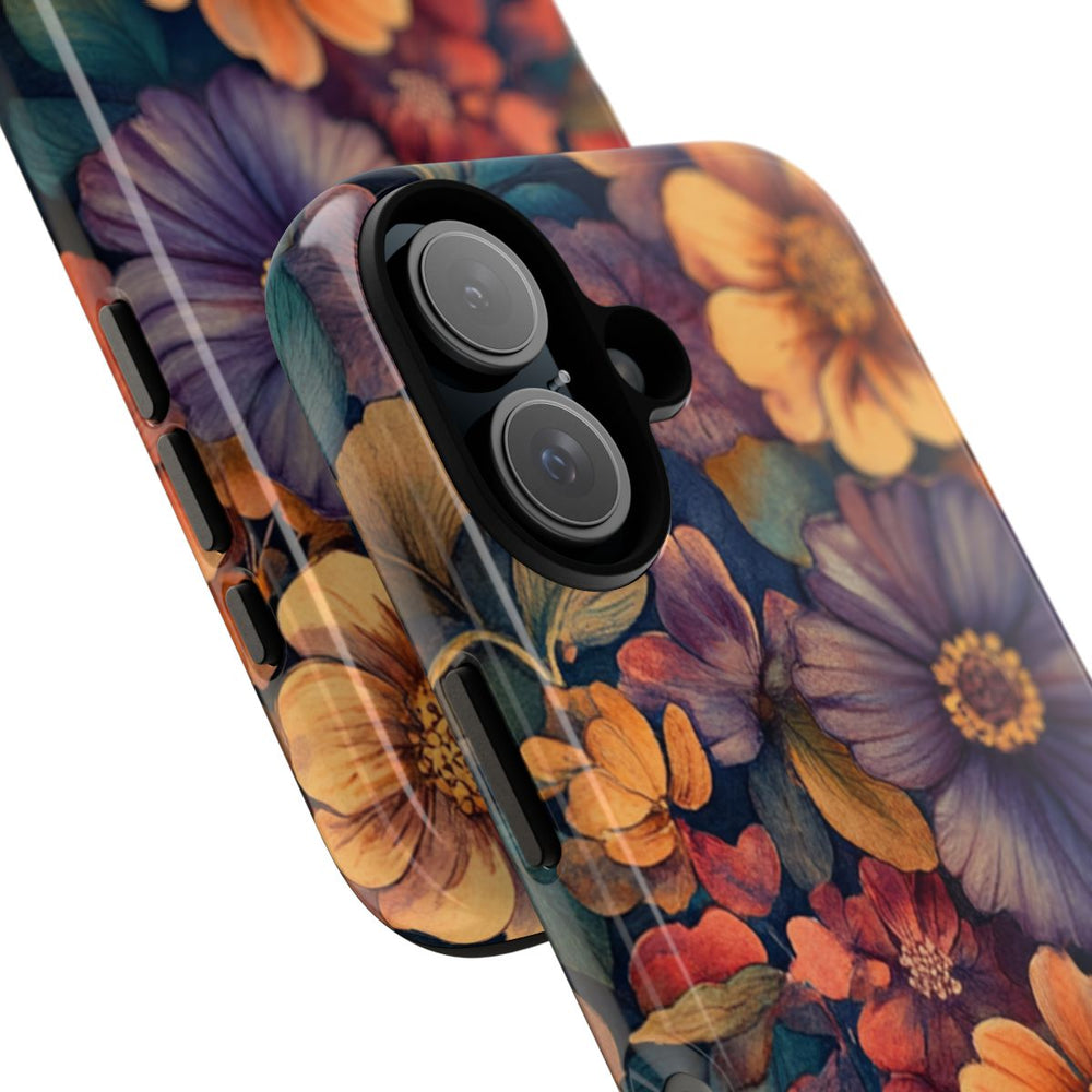 Dit hoesje heeft een dicht patroon van aquarel bloemen en bladeren in levendige, maar zachte kleuren. De bloemen zijn vooral oranje, perzik en paars en worden omringd door bladeren in verschillende groentinten. Het ontwerp heeft een rijke, geschilderde uitstraling met gedetailleerde bloemblaadjes en bladeren. Het patroon bedekt het gehele oppervlak en zorgt voor een naadloos bloemenmotief. Het glanzende, stevige hoesje is gemaakt van een dubbele laag polycarbonaat en TPU voor extra stevigheid en bescherming, en ondersteunt draadloos opladen.