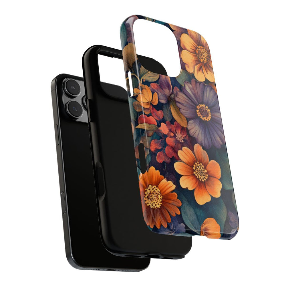 Dit hoesje heeft een dicht patroon van aquarel bloemen en bladeren in levendige, maar zachte kleuren. De bloemen zijn vooral oranje, perzik en paars en worden omringd door bladeren in verschillende groentinten. Het ontwerp heeft een rijke, geschilderde uitstraling met gedetailleerde bloemblaadjes en bladeren. Het patroon bedekt het gehele oppervlak en zorgt voor een naadloos bloemenmotief. Het glanzende, stevige hoesje is gemaakt van een dubbele laag polycarbonaat en TPU voor extra stevigheid en bescherming, en ondersteunt draadloos opladen.