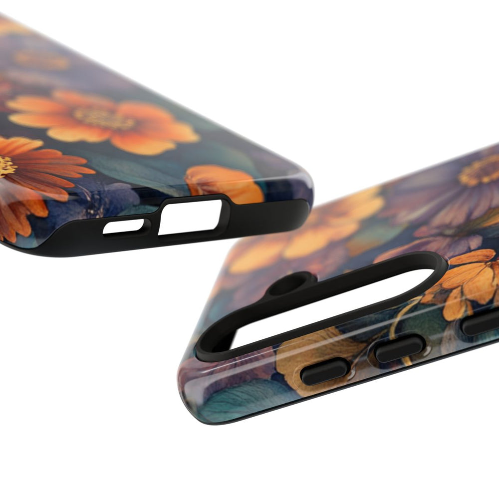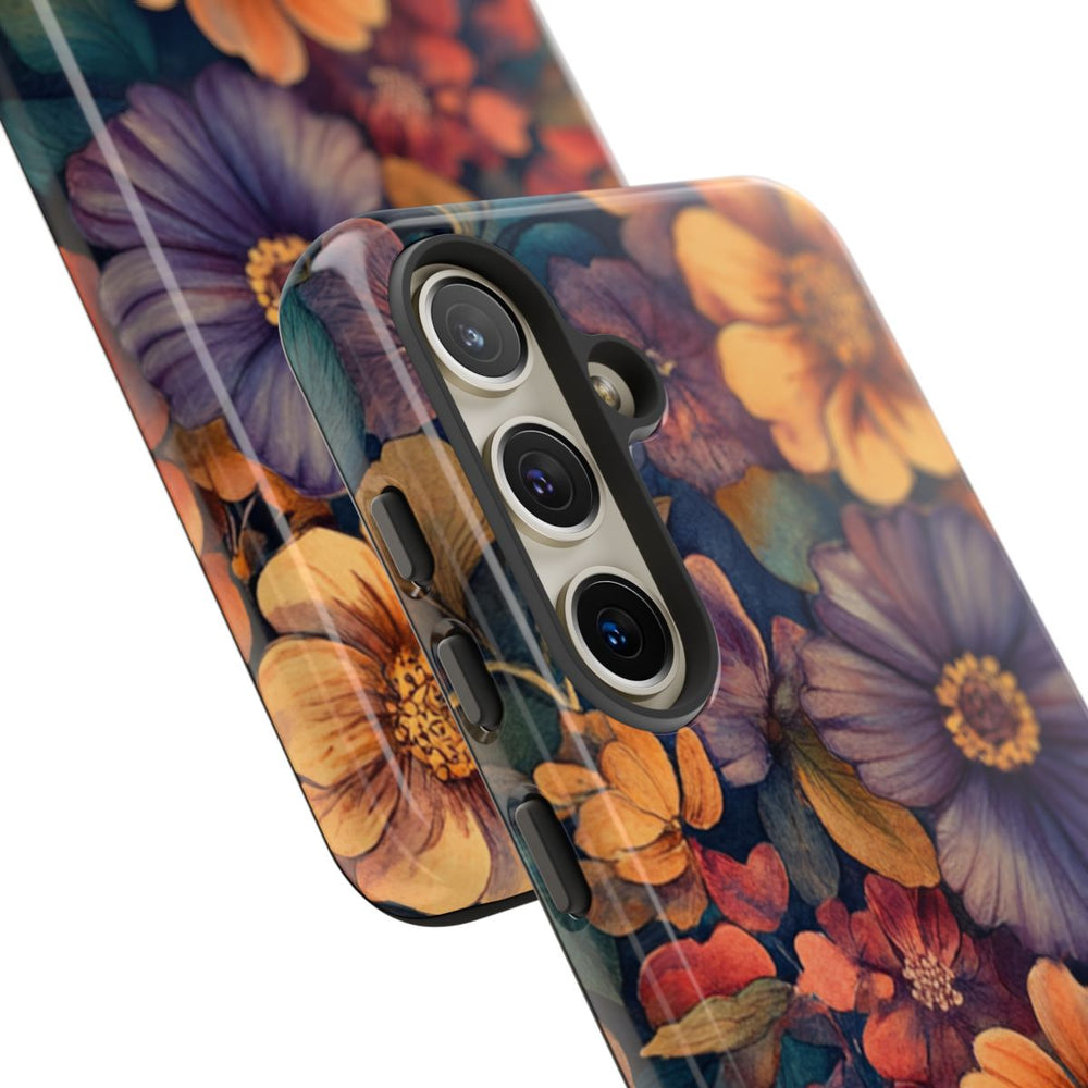 Dit hoesje heeft een dicht patroon van aquarel bloemen en bladeren in levendige, maar zachte kleuren. De bloemen zijn vooral oranje, perzik en paars en worden omringd door bladeren in verschillende groentinten. Het ontwerp heeft een rijke, geschilderde uitstraling met gedetailleerde bloemblaadjes en bladeren. Het patroon bedekt het gehele oppervlak en zorgt voor een naadloos bloemenmotief. Het glanzende, stevige hoesje is gemaakt van een dubbele laag polycarbonaat en TPU voor extra stevigheid en bescherming, en ondersteunt draadloos opladen.