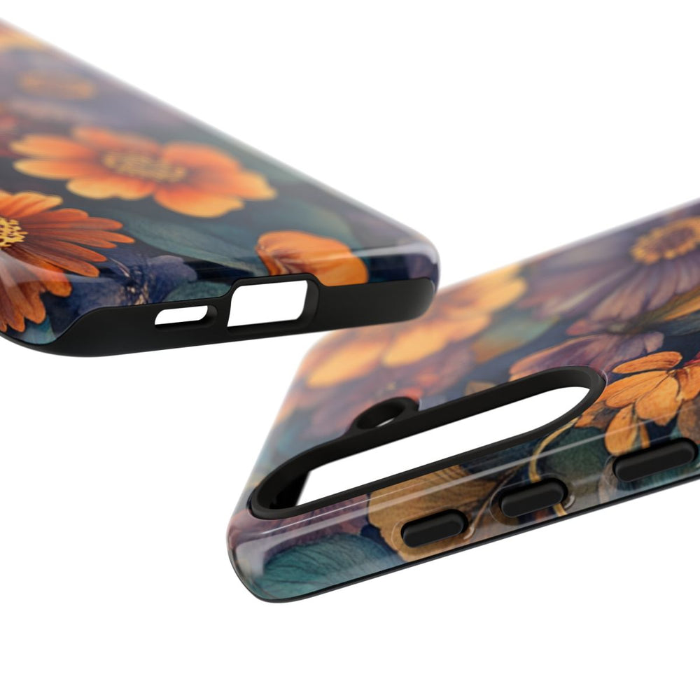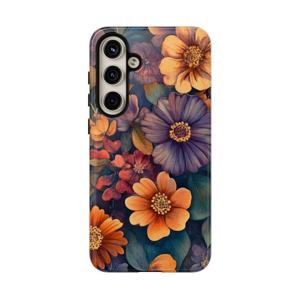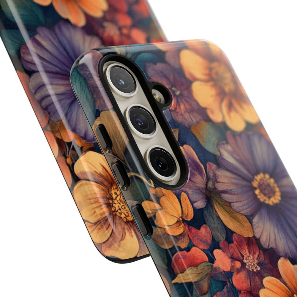 Dit hoesje heeft een dicht patroon van aquarel bloemen en bladeren in levendige, maar zachte kleuren. De bloemen zijn vooral oranje, perzik en paars en worden omringd door bladeren in verschillende groentinten. Het ontwerp heeft een rijke, geschilderde uitstraling met gedetailleerde bloemblaadjes en bladeren. Het patroon bedekt het gehele oppervlak en zorgt voor een naadloos bloemenmotief. Het glanzende, stevige hoesje is gemaakt van een dubbele laag polycarbonaat en TPU voor extra stevigheid en bescherming, en ondersteunt draadloos opladen.