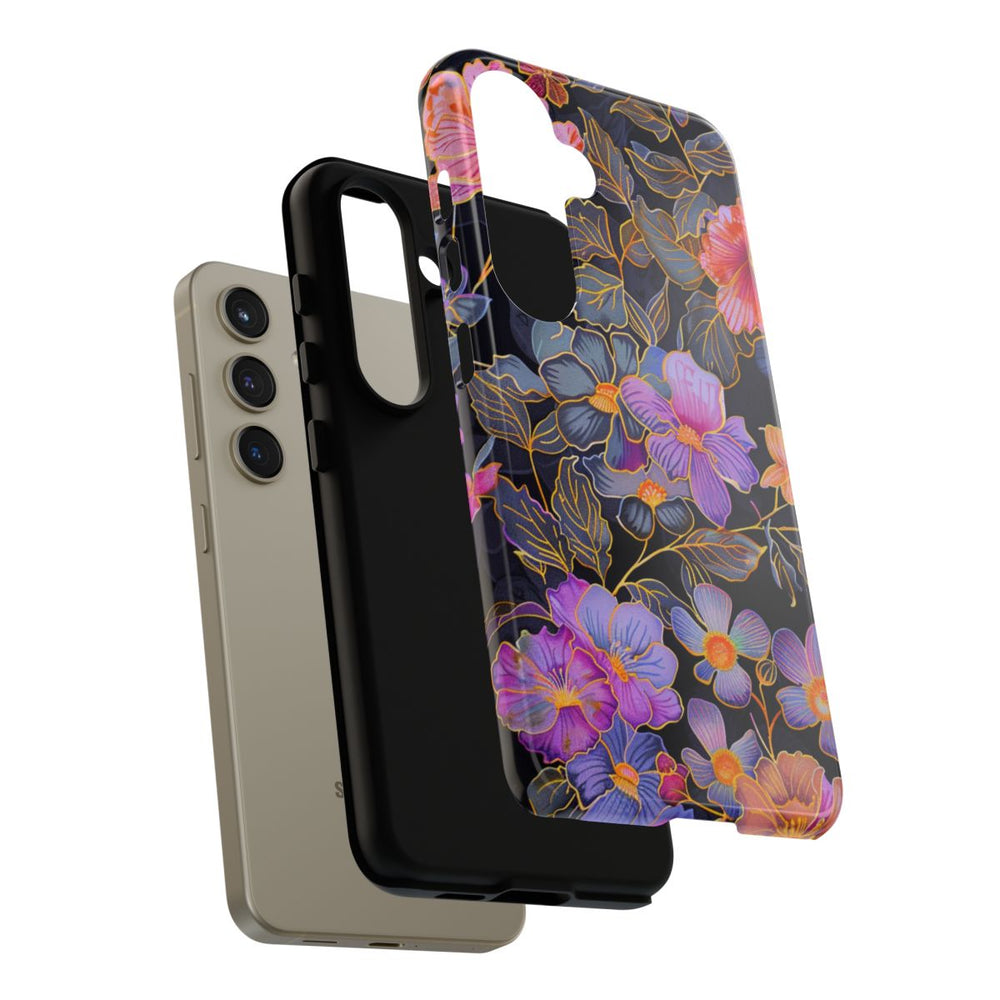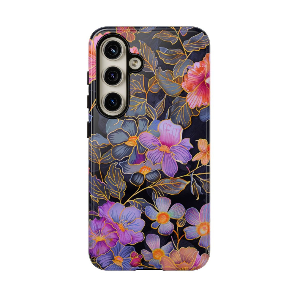 Dit hoesje is voorzien van een opvallend bloemenpatroon met diverse bloemen in roze, paarse, oranje en gele tinten. De bloemen zijn verfijnd afgewerkt met fijne gouden lijnen en komen prachtig uit tegen de diepe zwarte achtergrond, waardoor de heldere kleuren extra opvallen. De bladeren zijn weergegeven in gedempte grijze en blauwe tinten en zijn eveneens met goud omlijnd. Het patroon is gedetailleerd en elegant, wat zorgt voor een fraai contrast met de donkere ondergrond. Het hoesje heeft een glanzende afwerking, is gemaakt van polycarbonaat en TPU en biedt dubbele bescherming. Daarnaast ondersteunt het draadloos opladen.