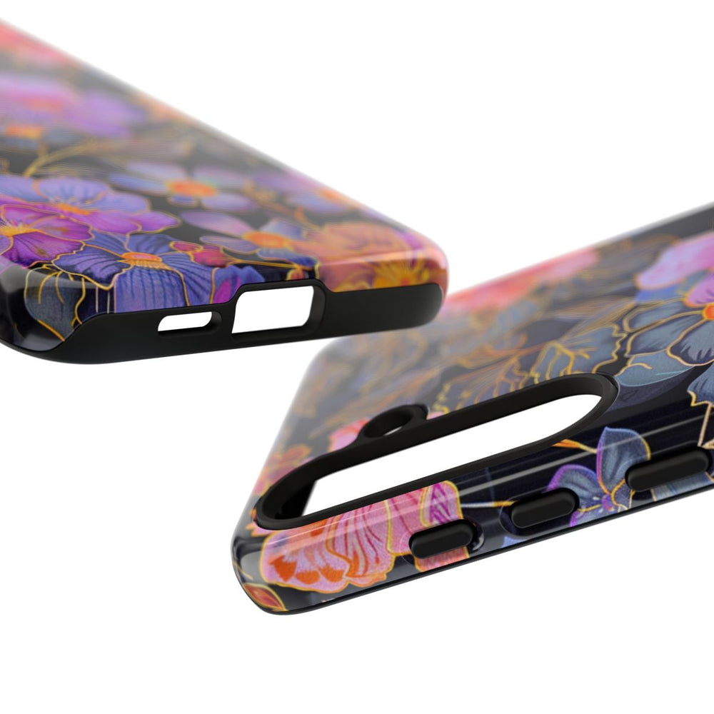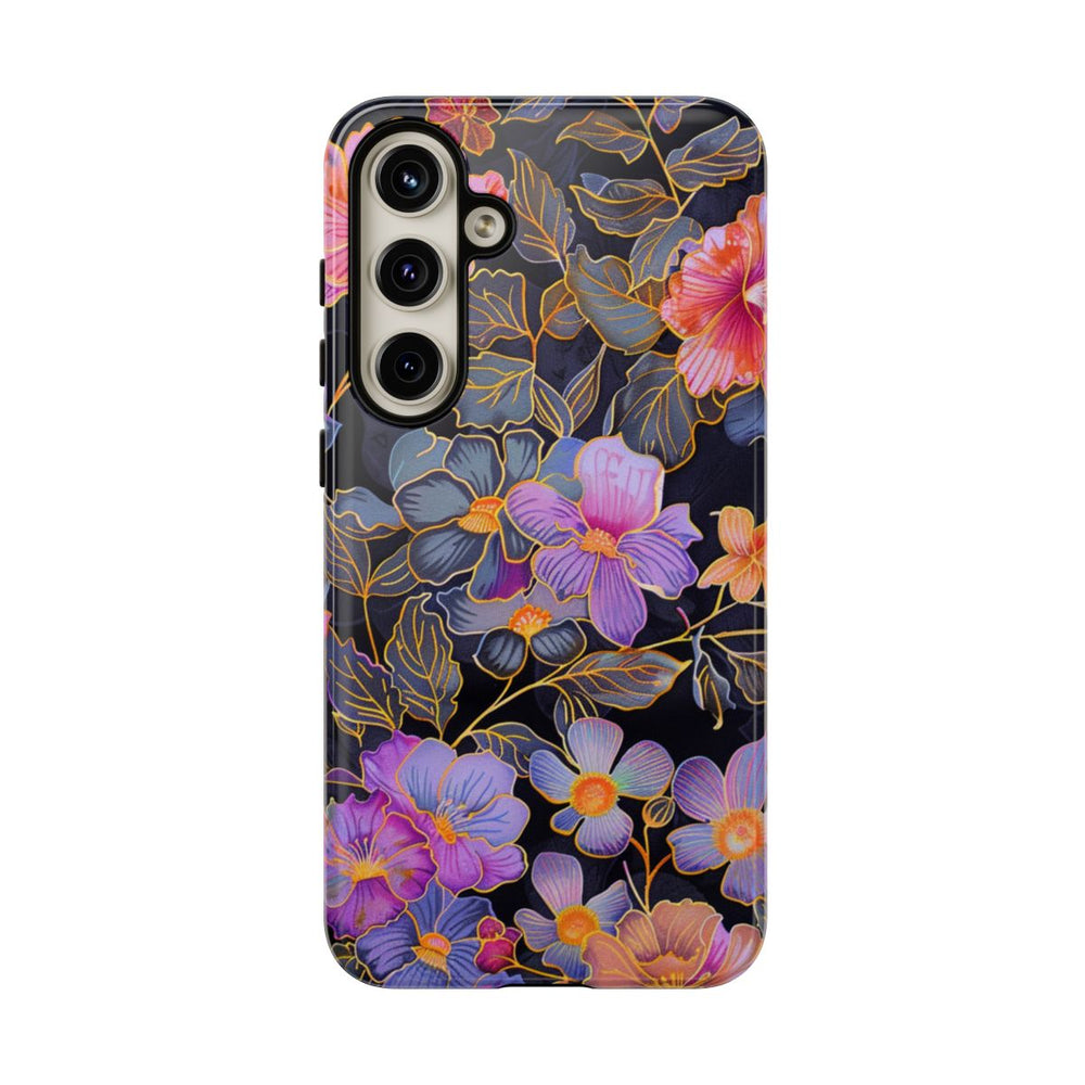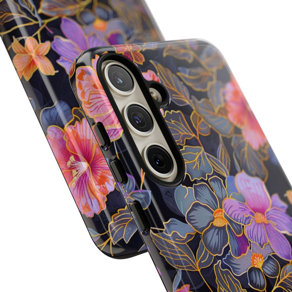 Dit hoesje is voorzien van een opvallend bloemenpatroon met diverse bloemen in roze, paarse, oranje en gele tinten. De bloemen zijn verfijnd afgewerkt met fijne gouden lijnen en komen prachtig uit tegen de diepe zwarte achtergrond, waardoor de heldere kleuren extra opvallen. De bladeren zijn weergegeven in gedempte grijze en blauwe tinten en zijn eveneens met goud omlijnd. Het patroon is gedetailleerd en elegant, wat zorgt voor een fraai contrast met de donkere ondergrond. Het hoesje heeft een glanzende afwerking, is gemaakt van polycarbonaat en TPU en biedt dubbele bescherming. Daarnaast ondersteunt het draadloos opladen.