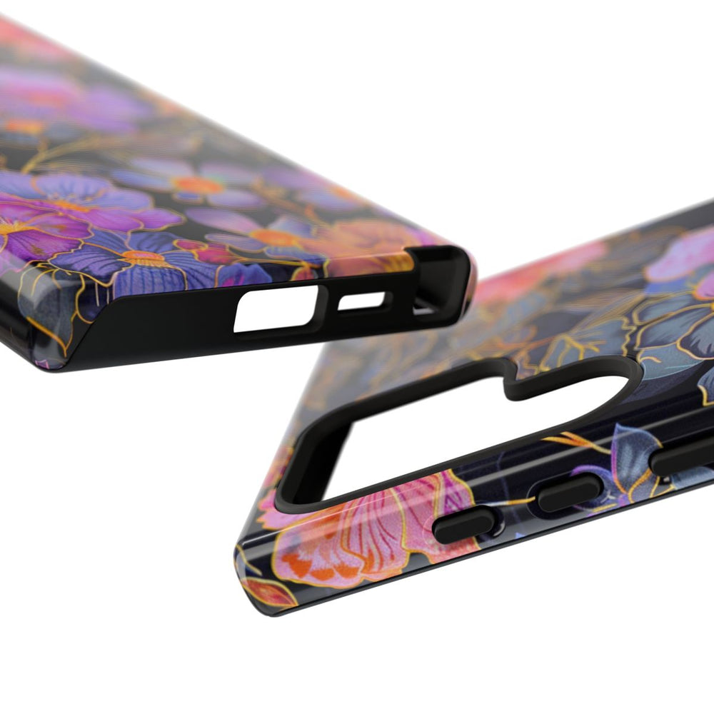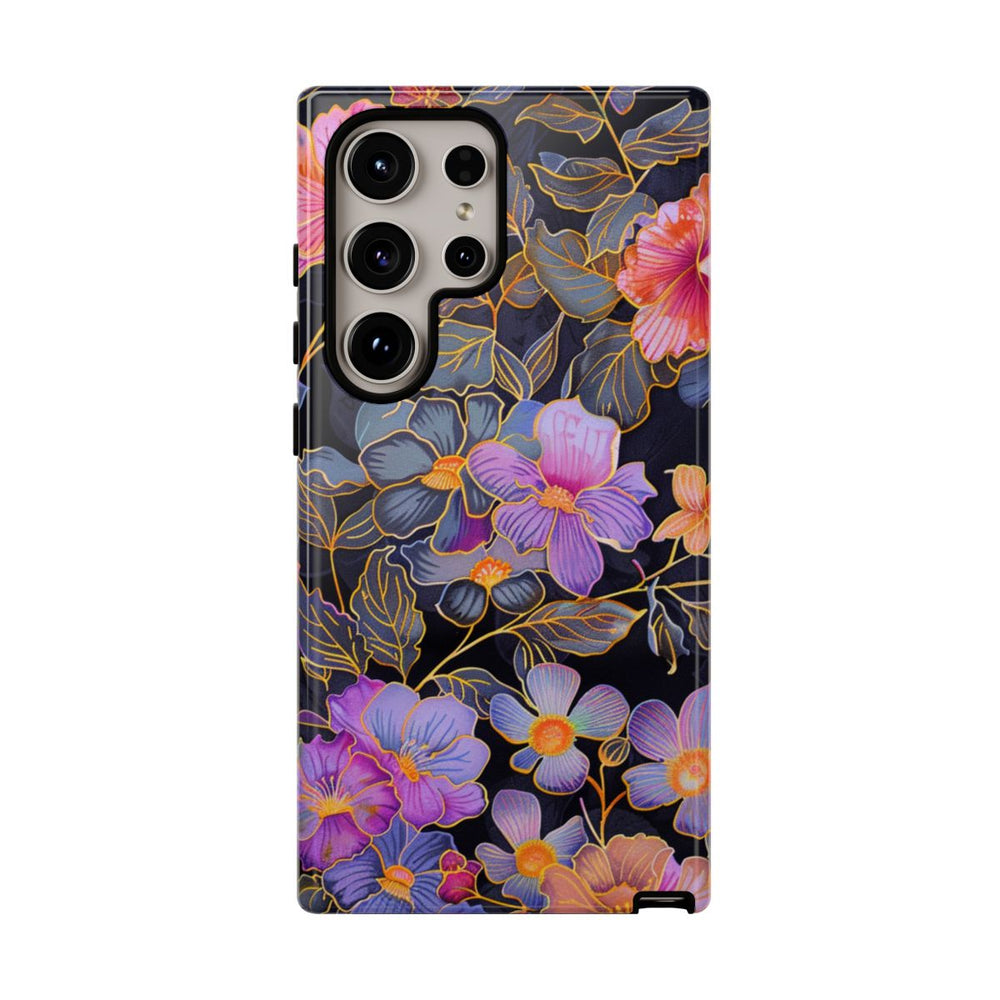 Dit hoesje is voorzien van een opvallend bloemenpatroon met diverse bloemen in roze, paarse, oranje en gele tinten. De bloemen zijn verfijnd afgewerkt met fijne gouden lijnen en komen prachtig uit tegen de diepe zwarte achtergrond, waardoor de heldere kleuren extra opvallen. De bladeren zijn weergegeven in gedempte grijze en blauwe tinten en zijn eveneens met goud omlijnd. Het patroon is gedetailleerd en elegant, wat zorgt voor een fraai contrast met de donkere ondergrond. Het hoesje heeft een glanzende afwerking, is gemaakt van polycarbonaat en TPU en biedt dubbele bescherming. Daarnaast ondersteunt het draadloos opladen.