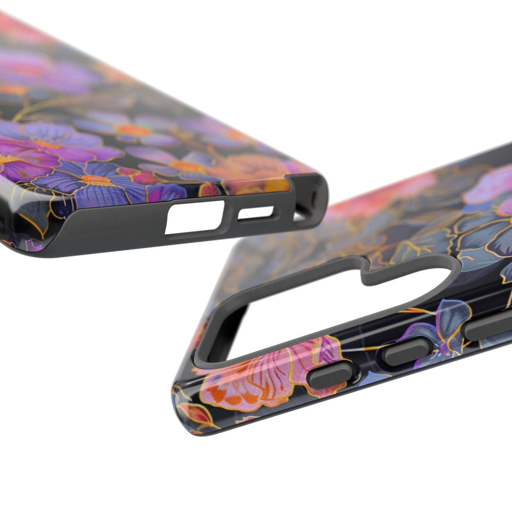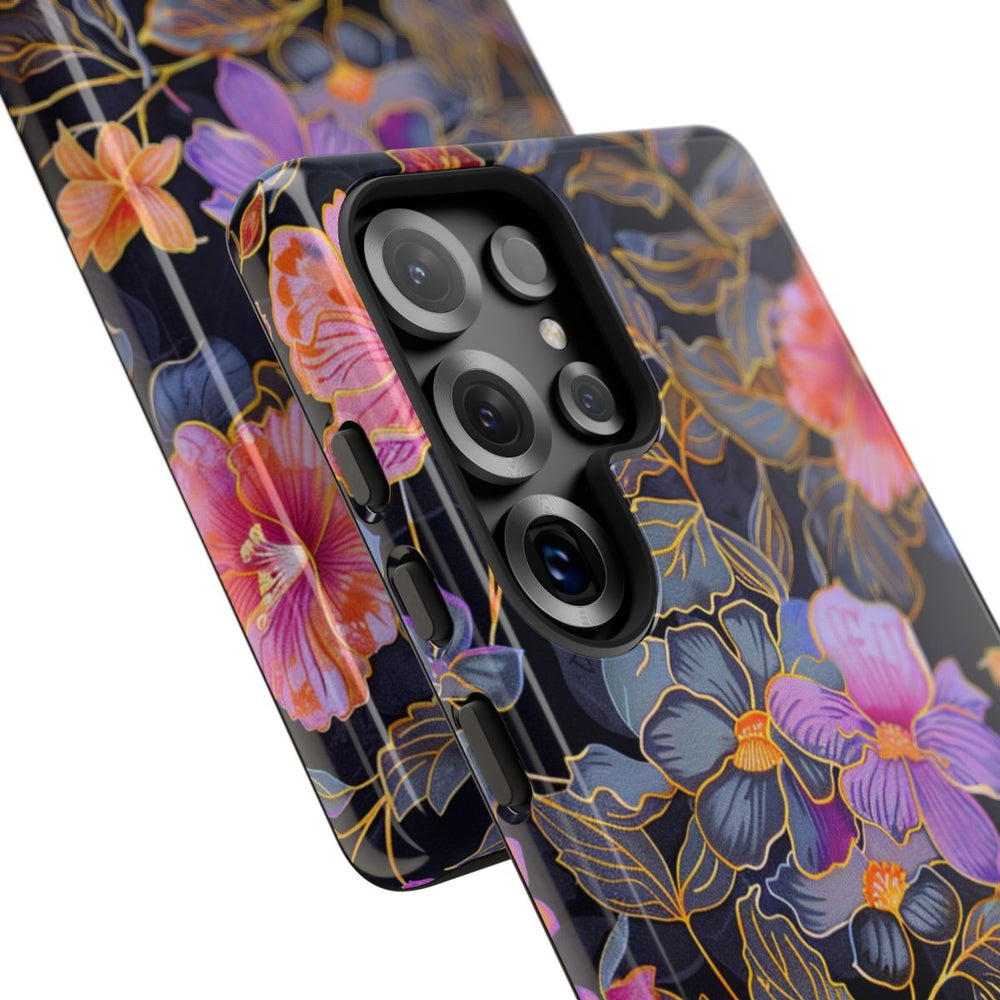 Dit hoesje is voorzien van een opvallend bloemenpatroon met diverse bloemen in roze, paarse, oranje en gele tinten. De bloemen zijn verfijnd afgewerkt met fijne gouden lijnen en komen prachtig uit tegen de diepe zwarte achtergrond, waardoor de heldere kleuren extra opvallen. De bladeren zijn weergegeven in gedempte grijze en blauwe tinten en zijn eveneens met goud omlijnd. Het patroon is gedetailleerd en elegant, wat zorgt voor een fraai contrast met de donkere ondergrond. Het hoesje heeft een glanzende afwerking, is gemaakt van polycarbonaat en TPU en biedt dubbele bescherming. Daarnaast ondersteunt het draadloos opladen.