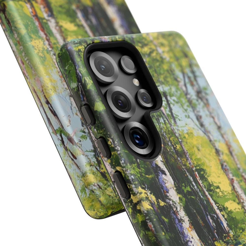 Dit kleurrijke ontwerp toont een levendig boslandschap met hoge bomen en een tapijt van blauwe hyacinten. De schildering combineert verschillende tinten groen en oranje, wat zorgt voor een frisse en uitnodigende sfeer. De dynamische penseelstreken geven diepte aan het bladerdek en de bloemen. Deze afbeelding is bedrukt op een mat en stevig hoesje van duurzame materialen, zodat je toestel goed beschermd is en het prachtige kunstwerk mooi uitkomt.