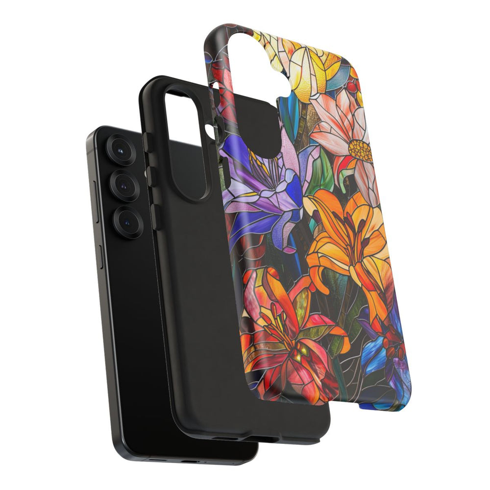 Dit hoesje is voorzien van een levendig glas-in-lood ontwerp met een kleurrijk bloemenmotief. De bloemen zijn uitgevoerd in tinten oranje, geel, paars, rood en blauw, met verfijnde details en opvallende omlijningen. De donkere achtergrond laat de heldere bloemen extra opvallen. Het ontwerp is gedrukt op een mat, stevig hoesje van polycarbonaat en TPU, dat bestaat uit twee lagen voor optimale bescherming en geschikt is voor draadloos opladen. Het geheel straalt een rijke, artistieke bloemenstijl met glas-in-lood effect uit.