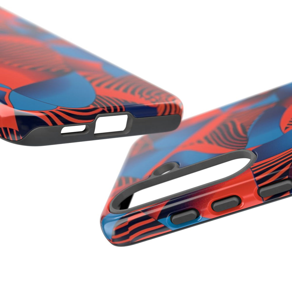 Dit telefoonhoesje is voorzien van een opvallend abstract patroon met vloeiende vormen in helder rood en diepblauw. De combinatie van soepele lijnen en gestreepte details zorgt voor een dynamisch en energiek uiterlijk. Het stevige hoesje heeft een glanzende afwerking en bestaat uit twee lagen: een polycarbonaat buitenkant en een TPU-binnenzijde voor extra bescherming. Het hoesje ondersteunt draadloos opladen en is bestand tegen invloeden van buitenaf, zodat het zijn mooie uitstraling langdurig behoudt.