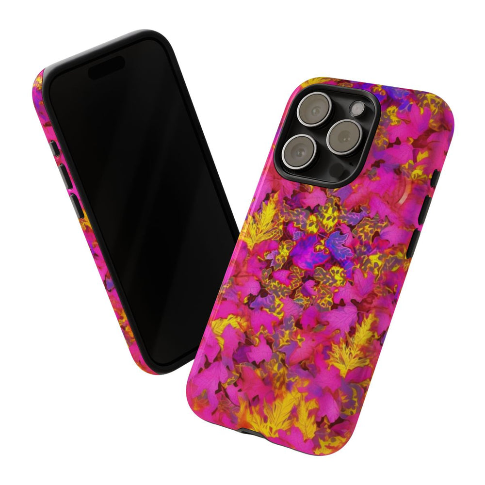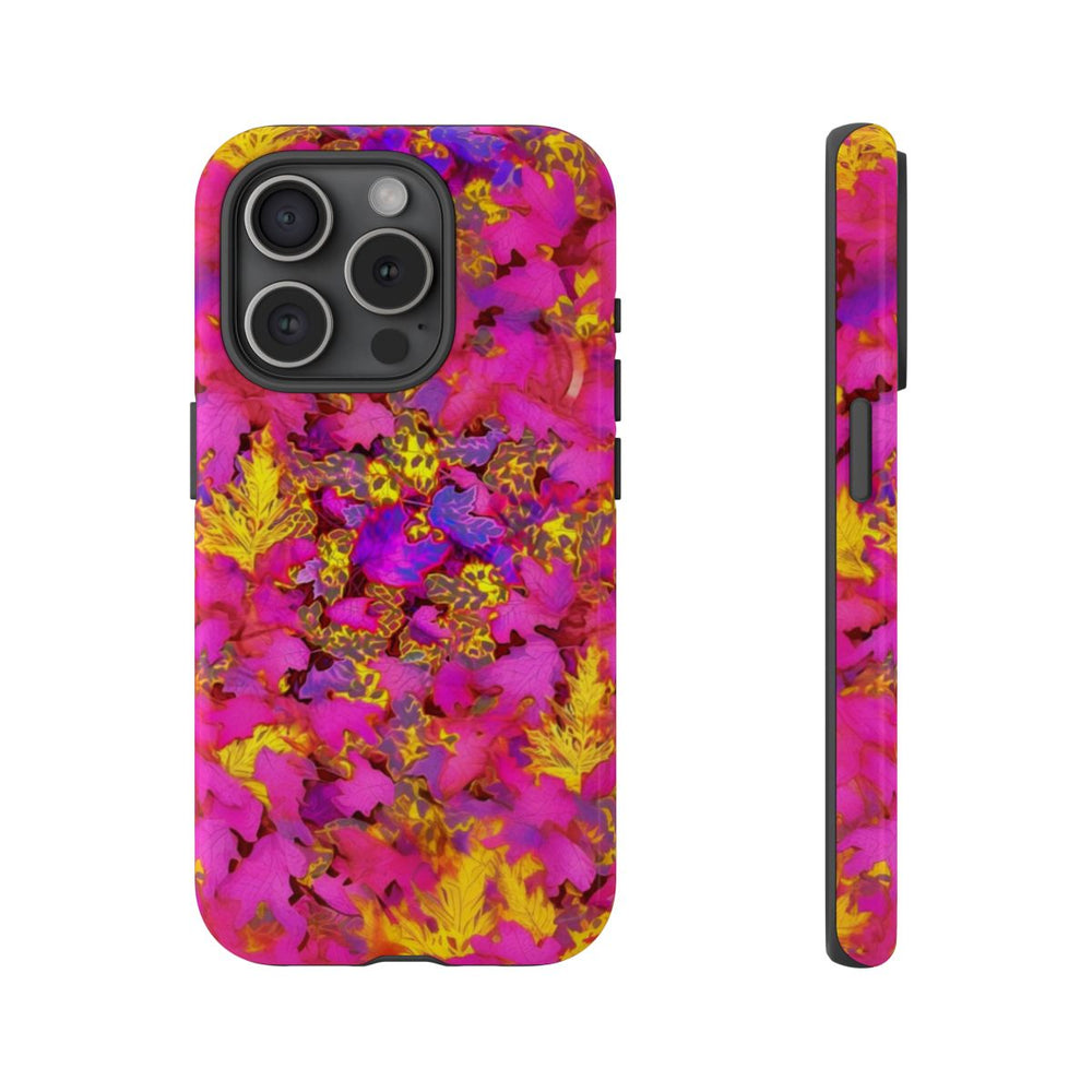 Dit hoesje heeft een dicht patroon van bladeren in heldere roze en gele tinten, wat zorgt voor een opvallend en energiek effect. De bladeren overlappen elkaar en zijn subtiel aangevuld met paarse en magenta accenten, wat diepte en complexiteit aan het ontwerp geeft. Het patroon is naadloos en zeer gedetailleerd, waardoor het perfect past bij een glanzend, stevig hoesje. Dit hoesje bestaat uit twee lagen: een stevige polycarbonaat buitenkant en een TPU-binnenzijde. Zo biedt het extra bescherming en duurzaamheid, en ondersteunt het draadloos opladen.